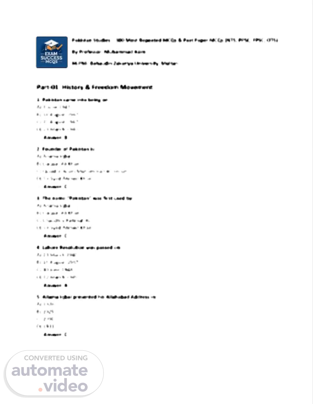 Pakistan Studies – 300 Most Repeated MCQs & Past Paper MCQs (NTS, PPSC, FPSC, OTS) By Professor: Muhammad Asim M.Phil. Bahaudin Zakariya University, Multan Part-01: History & Freedom Movement 1. Pakistan came into being on: A) 3 June 1947 B) 14 August 1947 C) 15 August 1947 D) 23 March 1940 ✅ Answer: B 2. Founder of Pakistan is: A) Allama Iqbal B) Liaquat Ali Khan C) Quaid-e-Azam Muhammad Ali Jinnah D) Sir Syed Ahmed Khan ✅ Answer: C 3. The name “Pakistan” was first used by: A) Allama Iqbal B) Liaquat Ali Khan C) Chaudhry Rehmat Ali D) Sir Syed Ahmed Khan ✅ Answer: C 4. Lahore Resolution was passed on: A) 23 March 1940 B) 14 August 1947 C) 30 June 1948 D) 12 March 1949 ✅ Answer: A 5. Allama Iqbal presented his Allahabad Address in: A) 1928 B) 1929 C) 1930 D) 1931 ✅ Answer: C.