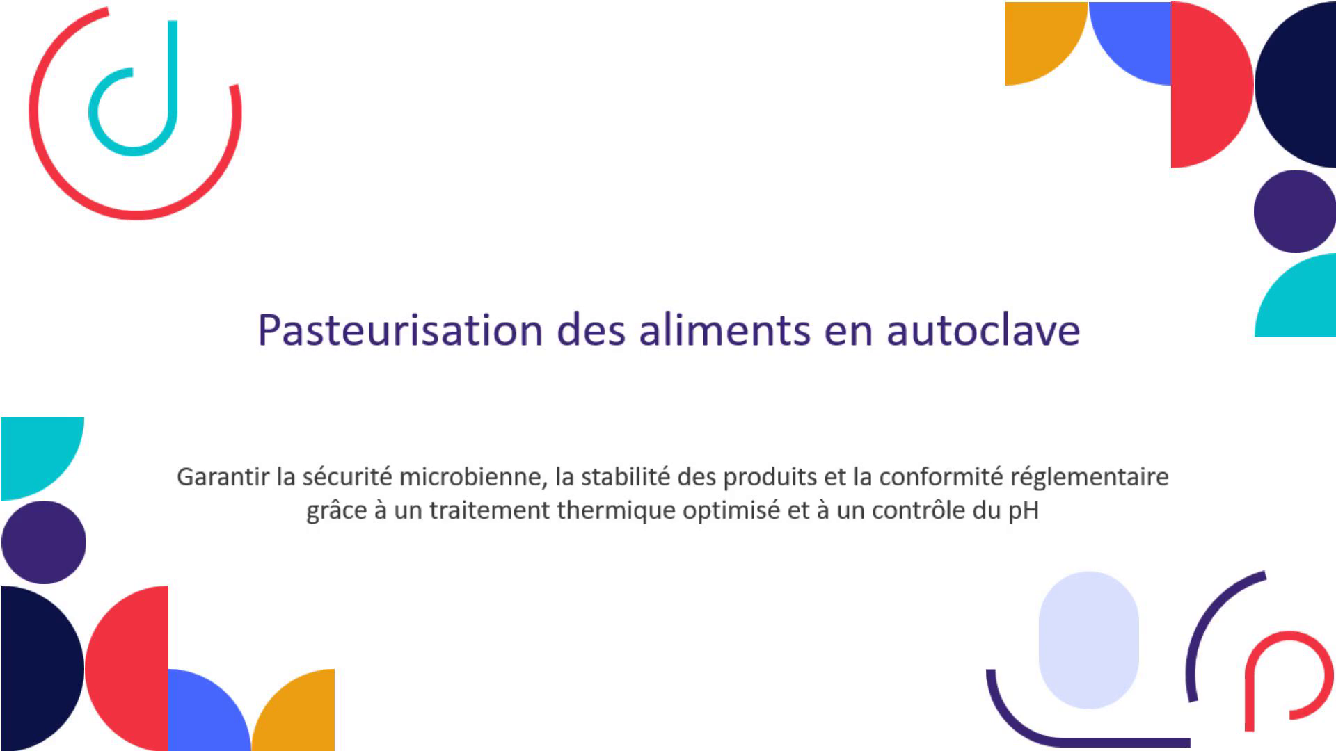 [Audio] Dans cette présentation, nous nous concentrons sur l'évaluation des risques microbiologiques liés à la pasteurisation en autoclave. Tout d'abord, nous identifions les micro-organismes cibles, qui comprennent des agents pathogènes infectieux comme Salmonella et Listeria, des producteurs de toxines tels que Clostridium botulinum et Staphylococcus aureus, et des spores d'altération comme Bacillus coagulans et Clostridium pasteurianum. Ensuite, nous effectuons une évaluation des risques afin d'identifier les pires scénarios de contamination. Cette étape est cruciale pour fixer des limites critiques sur le traitement thermique et les niveaux de pH, garantissant que le processus de pasteurisation contrôle efficacement les risques microbiologiques. Un point de contrôle clé est de maintenir le pH d'équilibre maximal en dessous de 4,6 dans les 24 heures, ce qui est essentiel pour prévenir la croissance de Clostridium botulinum. Cette limite de pH est un facteur critique pour la sécurité du produit. En ce qui concerne le traitement thermique, les normes exigent une réduction d'au moins 6 log des agents pathogènes infectieux. Par exemple, cela peut être accompli en appliquant un traitement thermique équivalent à 2 minutes à 70°C. Le respect de ces normes est essentiel pour garantir la sécurité microbiologique du produit. Enfin, la conception du procédé intègre ces risques microbiologiques en combinant traitement thermique et mesures de contrôle du pH. Cette approche intégrée garantit la sécurité du produit tout au long de sa durée de conservation en traitant efficacement les risques de contamination potentiels..