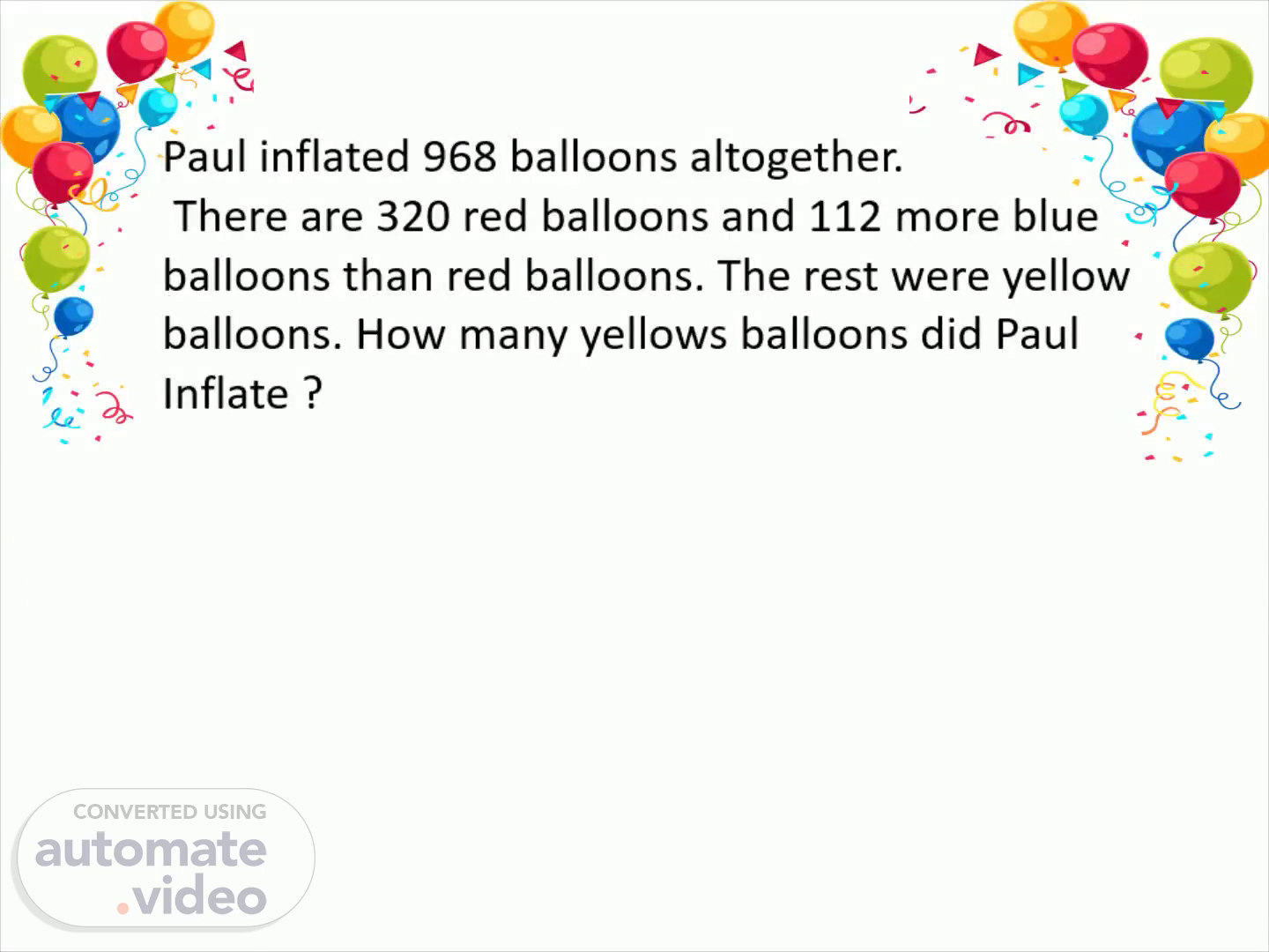Paul inflated 968 balloons altogether . There are 320 red balloons and 112 more blue balloons than red balloons . The rest were yellow balloons. How many yellows balloons did Paul Inflate ?.