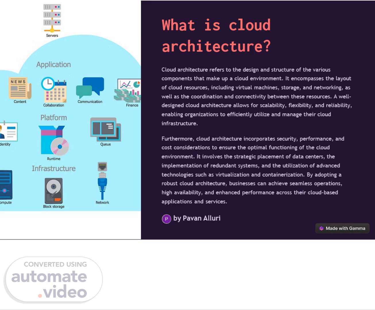 [Audio] What is cloud architecture? Cloud architecture refers to the design and structure of the various components that make up a cloud environment. It encompasses the layout of cloud resources including virtual machines storage and networking as well as the coordination and connectivity between these resources. A well designed cloud architecture allows for scalability flexibility and reliability enabling organizations to efficiently utilize and manage their cloud infrastructure. Furthermore cloud architecture incorporates security performance and cost considerations to ensure the optimal functioning of the cloud environment. It involves the strategic placement of data centers the implementation of redundant systems and the utilization of advanced technologies such as virtualization and containerization. By adopting a robust cloud architecture businesses can achieve seamless operations high availability and enhanced performance across their cloud-based applications and services. by Pavan Alluri.
