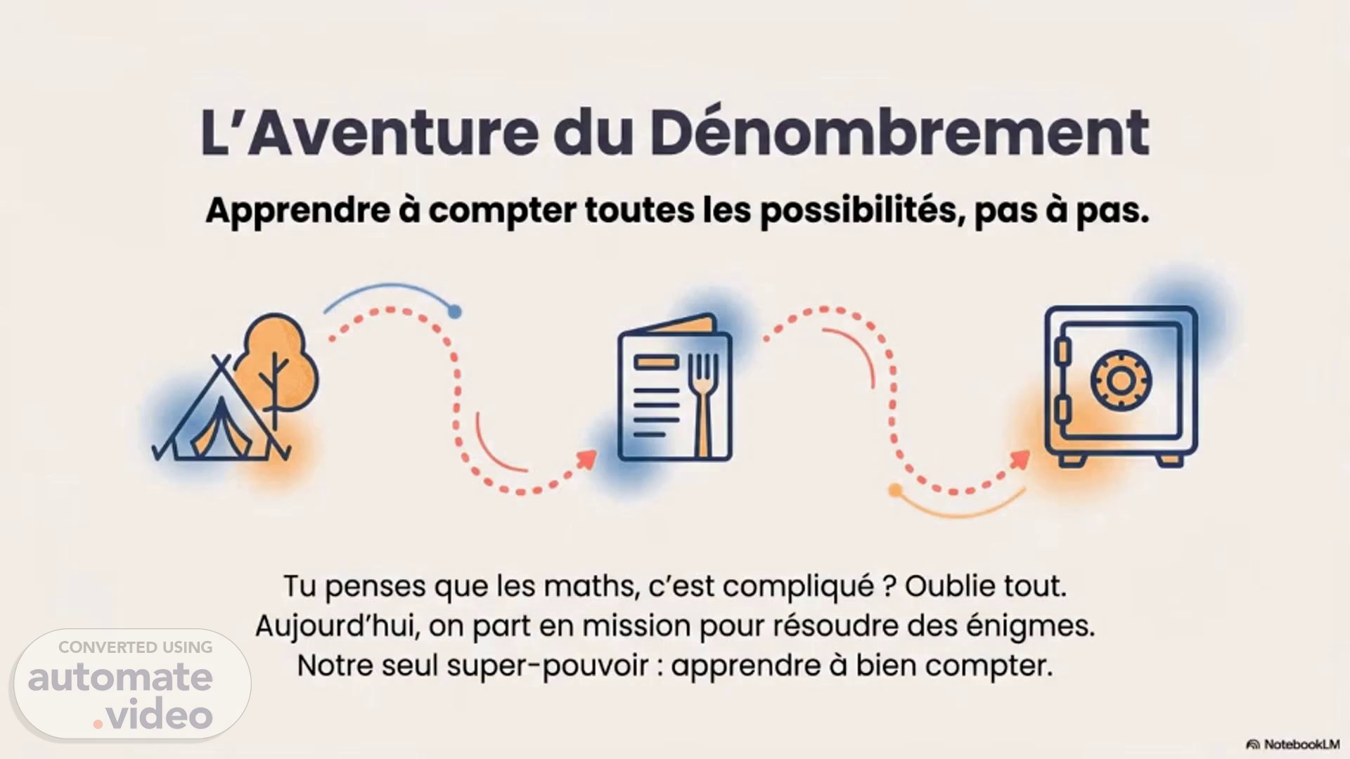 L'Aventure du Dénombrement Apprendre d compter toutes Ies possibilités, pas d pas. Tu penses que les maths, c'est compliqué ? Oublie tout. Aujourd'hui, on part en mission pour résoudre des énigmes. Notre seul super-pouvoir : apprendre d bien compter. NotebookLM.