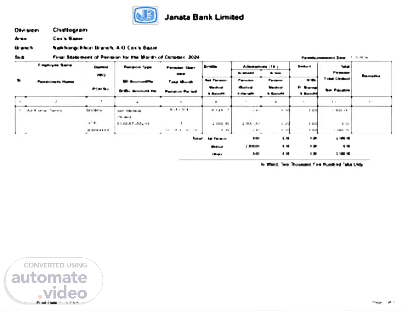 Janata Bank Limited Chattogram Division : Cox's Bazar Area: : : Naikhongchhori Branch, A.O Cox's Bazar Branch Final Statement of Pension for the Month of October, 2024 Sub: : 11/3/2024 Reimbursement Date SL Bankid Pension Type Pensioners Name SB AccountNo Pension Total Pension Remarks S.Benefit PCN No. Allowances (Tk.) Availedd Arrear Deduct Pension Medical S.Benefit SHBL S.Benefit PPO Pension Period Employee Name Entitle Medical Net Pension SHBL Account No Total Month Medical Net Payable S.Benefit 1 2 3 4 5 6 7 8 9 11 10 R. Stamp Total Deduct Pension Start date 900804 Self Medical Pension 0.00 Ajit Kumar Sarma 18,148.17 0.00 2,500.00 0.00 30/11/2011 1 0100081355244 3730 2,500.00 2,500.00 0.00 0.00 0.00 1 026900001 0.00 0.00 0.00 0.00 Oct, 24 to Oct, 24 2,500.00 Total 0.00 2,500.00 0.00 0.00 0.00 0.00 0.00 0.00 0.00 2,500.00 0.00 Net Pension Medical Others 2,500.00 In Word: Two Thousand Five Hundred Taka Only Page 1 of 1 Print Date 11/3/2024.