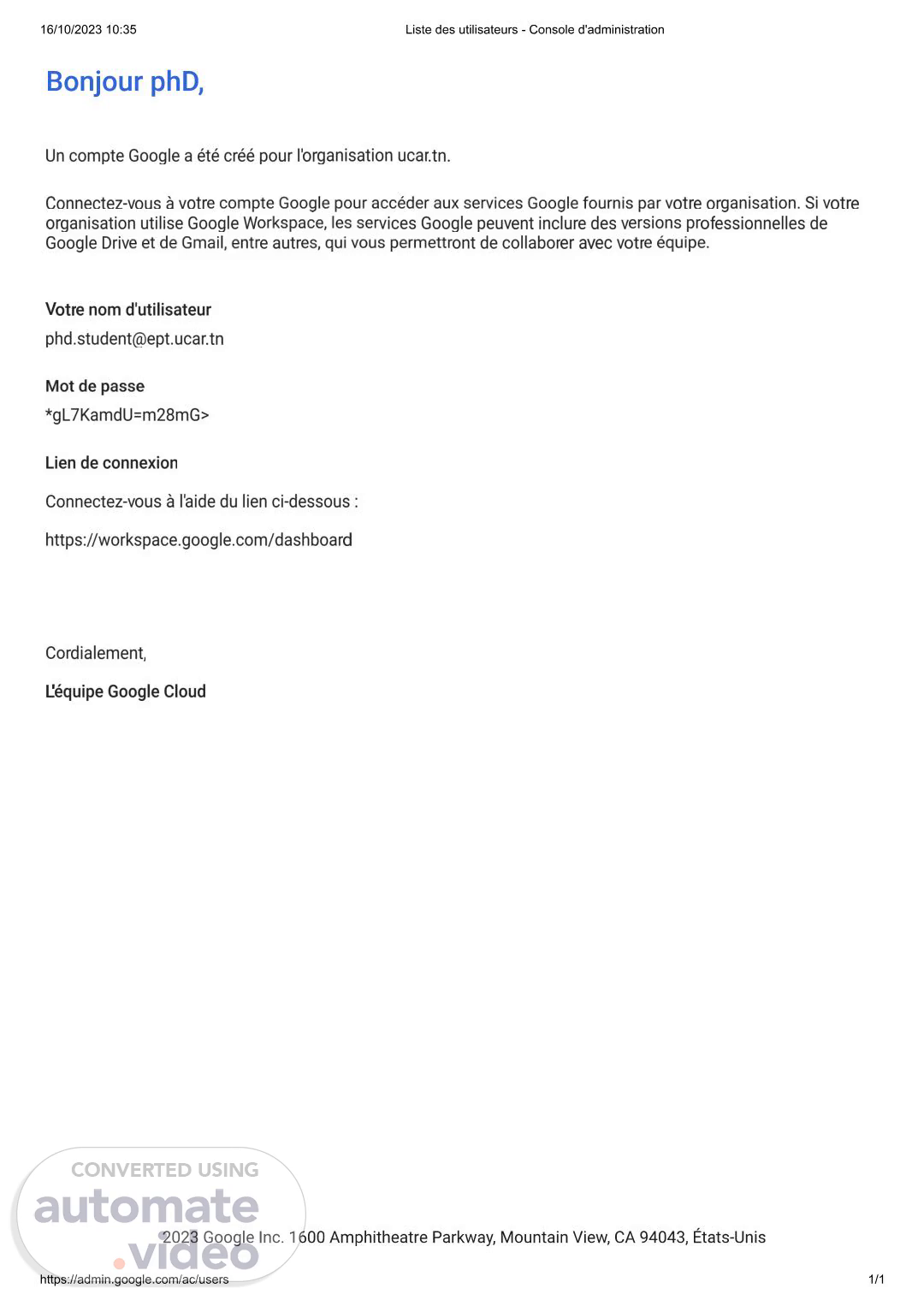 Bonjour PhD, Un compte Google a été créé pour l'organisation ucar.tn. Connectez-vous å votre compte Google pour accéder aux services Google fournis par votre organisation. Si votre organisation utilise Google Workspace, les services Google peuvent inclure des versions professionnelles de Google Drive et de Gmail, entre autres, qui vous permettront de collaborer avec votre équipe. Votre nom d'utilisateur [email protected] Mot de passe *gL7KamdU=m28mG> Lien de connexion Connectez-vous ä l'aide du lien ci-dessous : https://workspace.google.com/dashboard Cordialement Céquipe Google Cloud 2023 Google Inc. 1600 Amphitheatre Parkway, Mountain View, CA 94043, États-Unis.