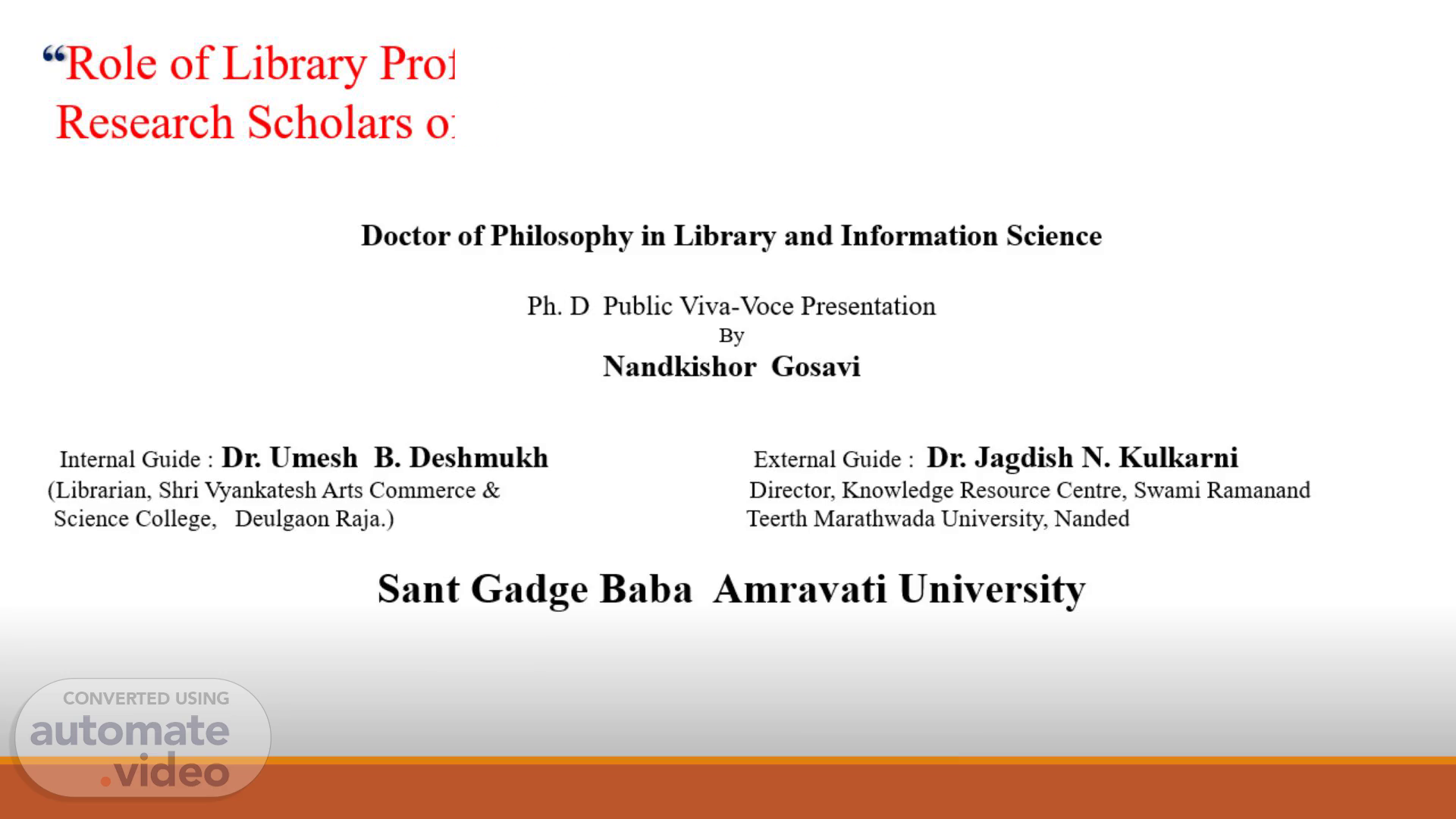 “Role of Library Professionals in Using Anti-Plagiarism tool by the Research Scholars of Higher Education Institutes in Maharashtra” Submitted to For the Degree of.