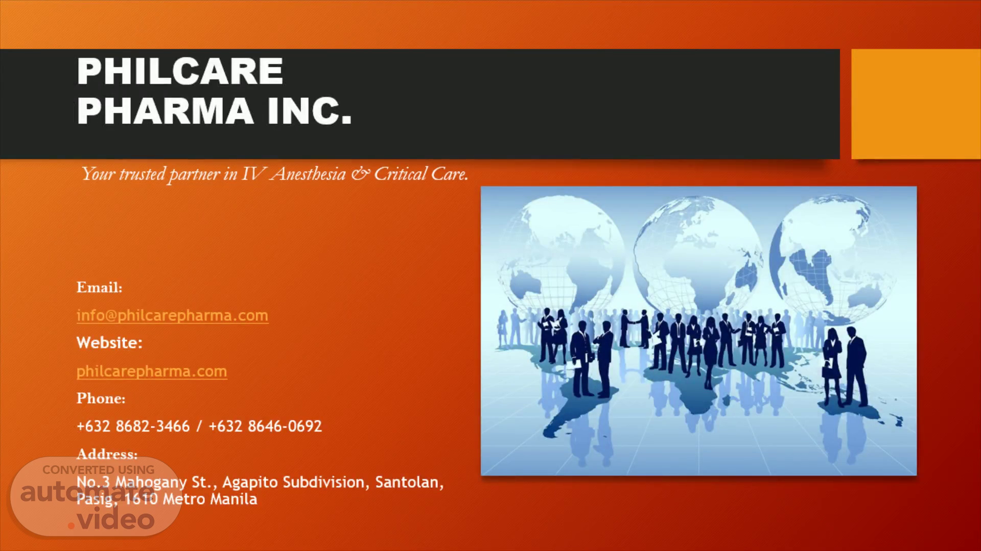 PHILCARE PHARMA INC.. Your trusted partner in IV Anesthesia & Critical Care. Email: [email protected] Website: philcarepharma.com Phone: +632 8682-3466 / +632 8646-0692 Address: No.3 Mahogany St., Agapito Subdivision, Santolan, Pasig, 1610 Metro Manila.