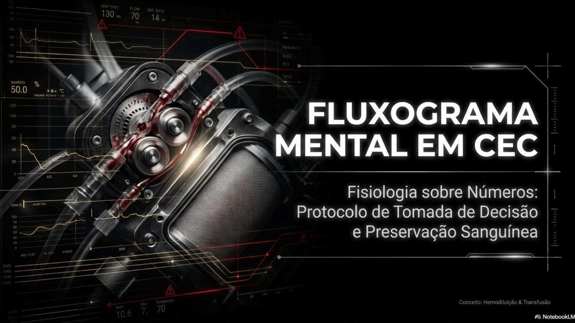 Ft ow SAT VontX)3 % 50.0 FLUXOGRAMA MENTAL EM CEC Fisiologia sobre Nümeros: Protocolo de Tomada de Decisäo e Preservaqäo Sanguinea Conceito: HemodiluiGäo & Transfusäo NotebookLM.