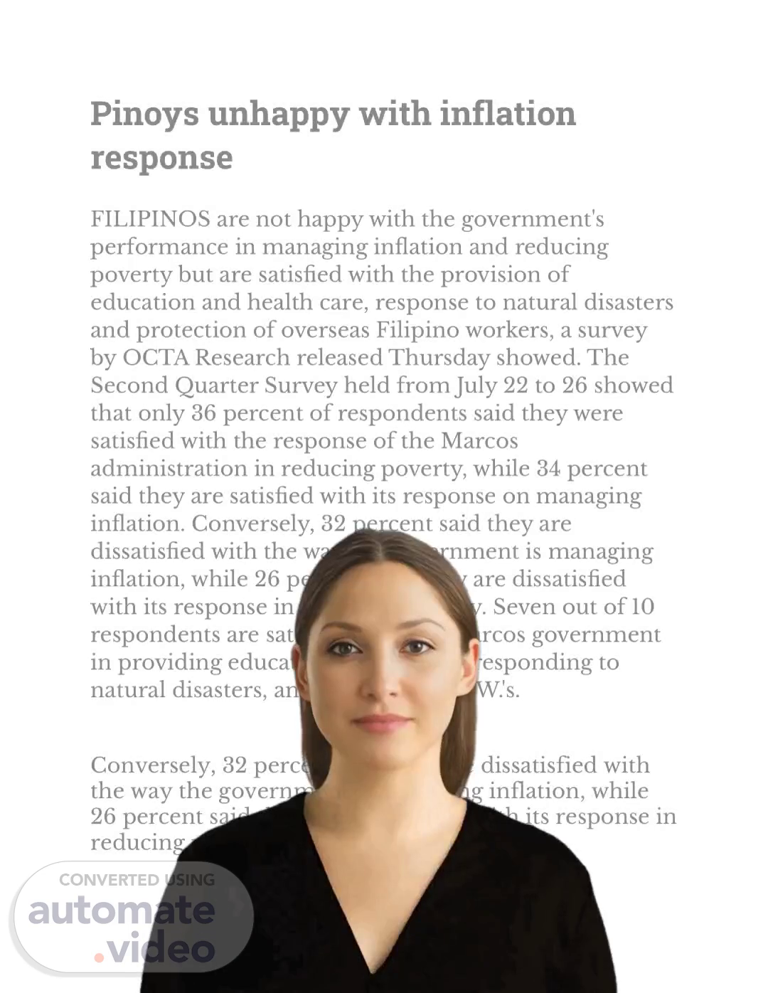 [Audio] The survey highlighted the opinion of 1,200 Filipinos, aged 18 and above, about how they think the Marcos administration is performing in reducing poverty and in managing inflation. The survey had a margin of error of three to six percent, depending on the region. It is essential to take note of these results as we move forward. Thank you for your attention..