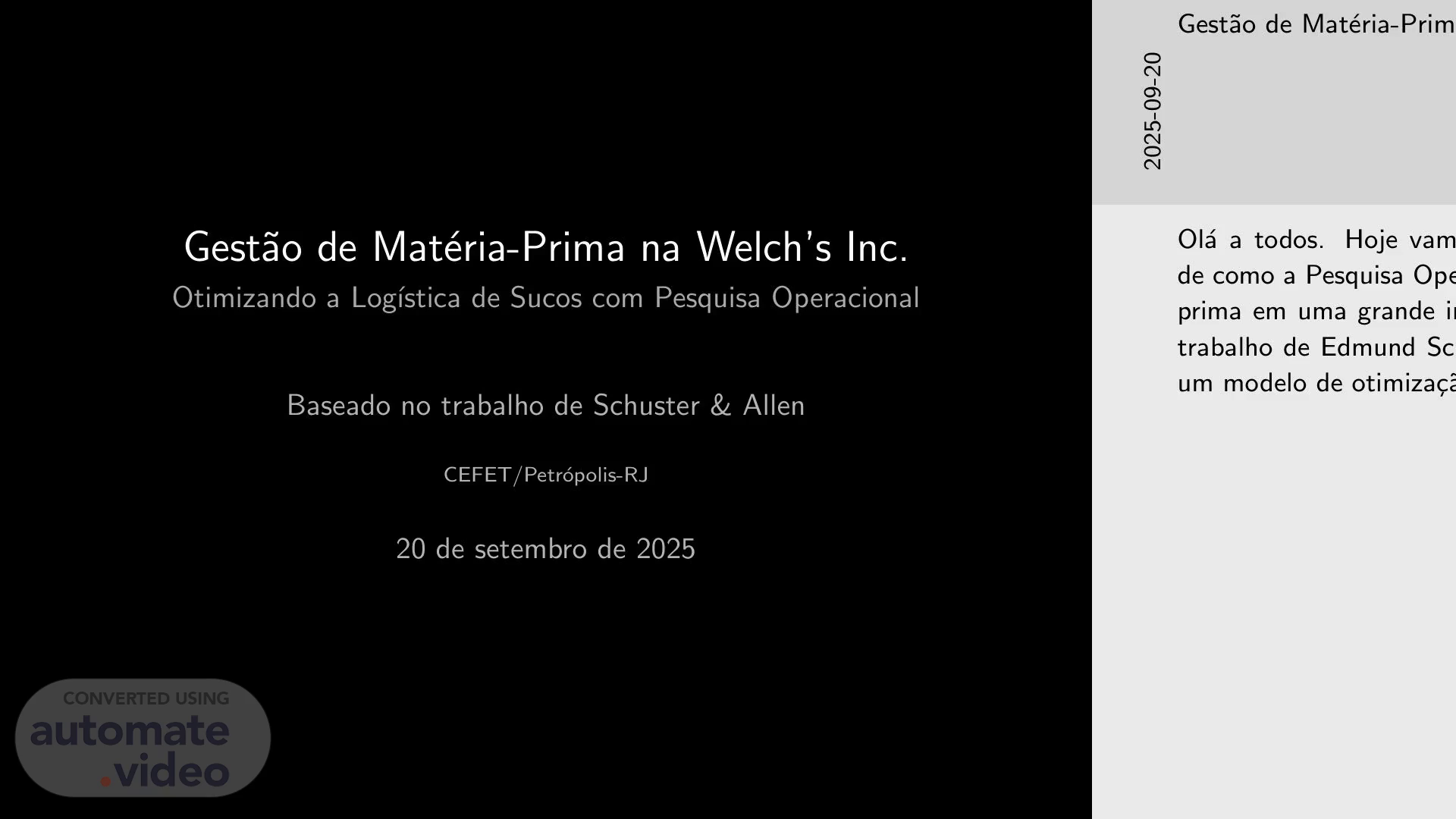 [Audio] Gest˜ao de Mat´eria-Prima na Welch's Inc. Gest˜ao de Mat´eria-Prima na Welch's Inc. Otimizando a Log´ıstica de Sucos com Pesquisa Operacional Baseado no trabalho de Schuster & Allen CEFET/Petr´opolis-RJ 20 de setembro de 2025 2025-09-20 Gest˜ao de Mat´eria-Prima na Welch's Inc. Otimizando a Log´ıstica de Sucos com Pesquisa Operacional Ol´a a todos. Hoje vamos apresentar o caso da Welch's, um exemplo cl´assico de como a Pesquisa Operacional foi utilizada para otimizar a gest˜ao de mat´eriaprima em uma grande ind´ustria de alimentos. Esta apresenta¸c˜ao ´e baseada no trabalho de Edmund Schuster e Stuart Allen, que detalha a implementa¸c˜ao de um modelo de otimiza¸c˜ao para a log´ıstica de sucos na empresa. Baseado no trabalho de Schuster & Allen CEFET/Petr´opolis-RJ 20 de setembro de 2025.