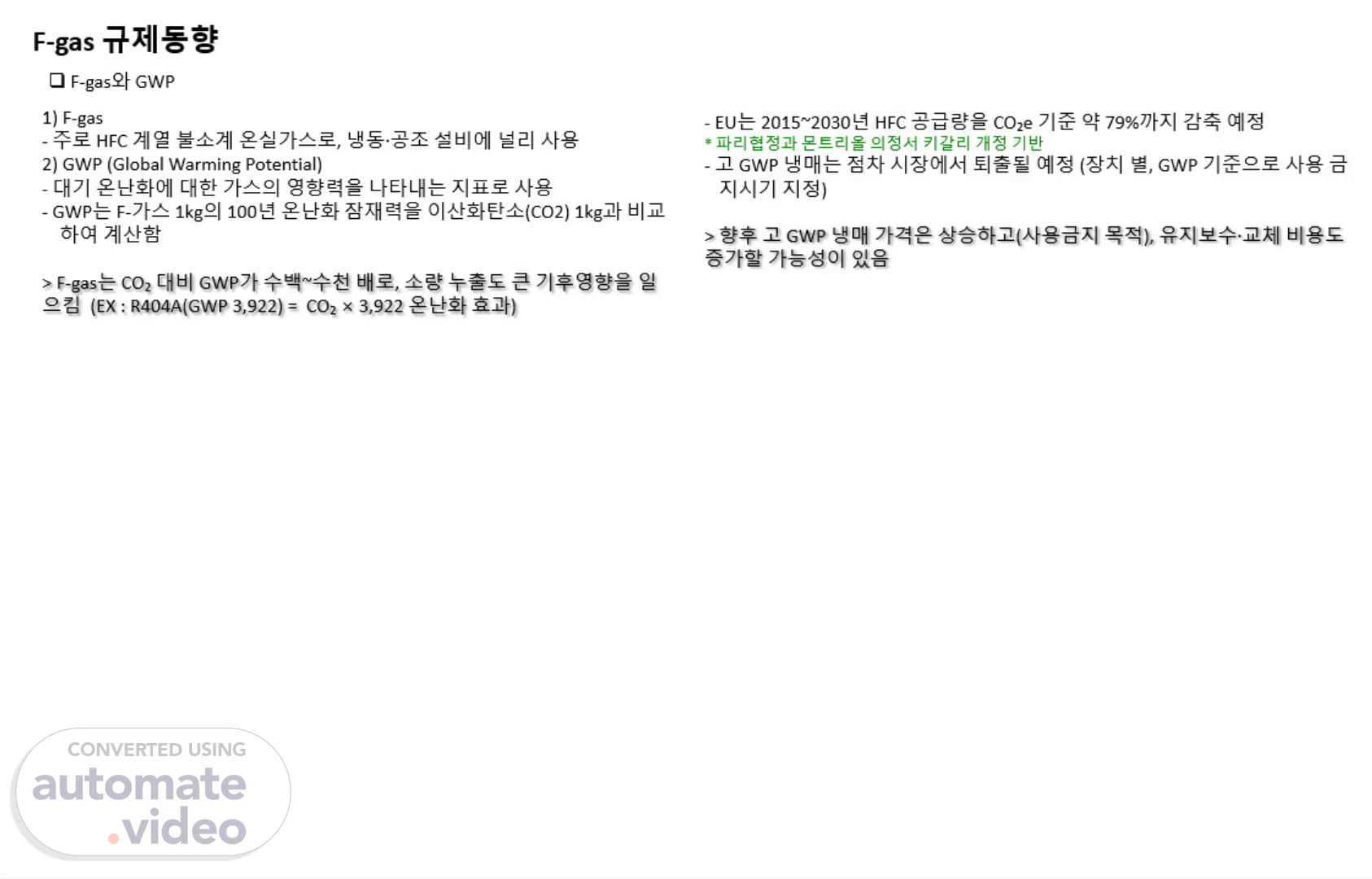 [Audio] F‑가스는 주로 HFC 계열 냉매를 포함하는 불소계 온실가스로, 냉동창고와 공조설비, 차량 냉각장치에 널리 사용됩니다.​지구온난화지수, GWP는 F‑가스 1kg이 100년 동안 대기 온난화에 미치는 영향을 CO₂ 1kg과 비교한 값입니다.​ 대표 냉매인 R404A는 GWP가 3,922로, 같은 양의 CO₂보다 약 3,900배 강력한 온실가스입니다.​그래서 설비에서 조금만 누출돼도 회사 온실가스 배출과 기후 영향이 크게 늘어나게 됩니다.​ EU F‑gas 규정은 이러한 배출을 줄이기 위해 냉매 생산·소비를 단계적으로 감축하고, 일정 냉매량 이상 사용하는 설비에 대해 누출검사, 기록 유지, 인증 인력 작업을 의무화하고 있습니다.국제적으로는 파리협정과 몬트리올 의정서 키갈리 개정을 통해 HFC를 포함한 F‑가스를 2015년 대비 2030년까지 약 79% 감축하는 계획이 추진 중입니다. 이 계획에 따라 고 GWP 냉매는 사용 금지 시기가 정해지고, 시장 공급도 크게 줄어들면서 가격 상승과 유지보수 비용 증가가 예상됩니다.결국 우리 설비에서 발생하는 F‑gas 누출은 탄소배출, 규제 위반 리스크, 고객사의 ESG 요구 미충족으로 바로 연결되기 때문에, 단순한 기술 문제가 아니라 법인 경영 이슈로 관리해야 합니다..