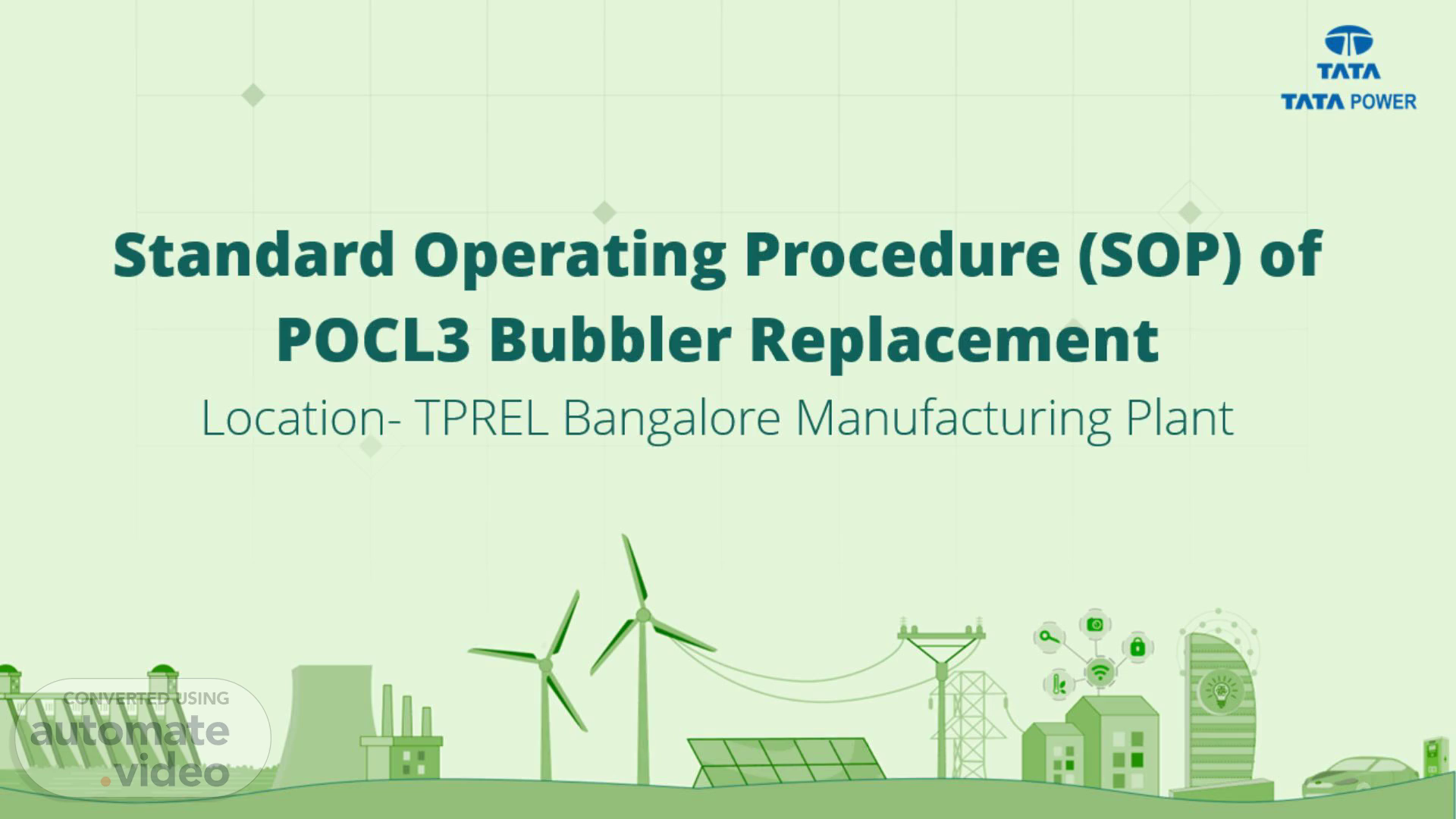 [Audio] "Standard Operating Procedure. POCL₃ Bubbler Replacement. This video explains the safe method for handling, removing, and installing a POCL ₃ bubbler at the TPREL Bangalore facility in cell production line, ensuring full compliance with safety and chemical control requirements.".