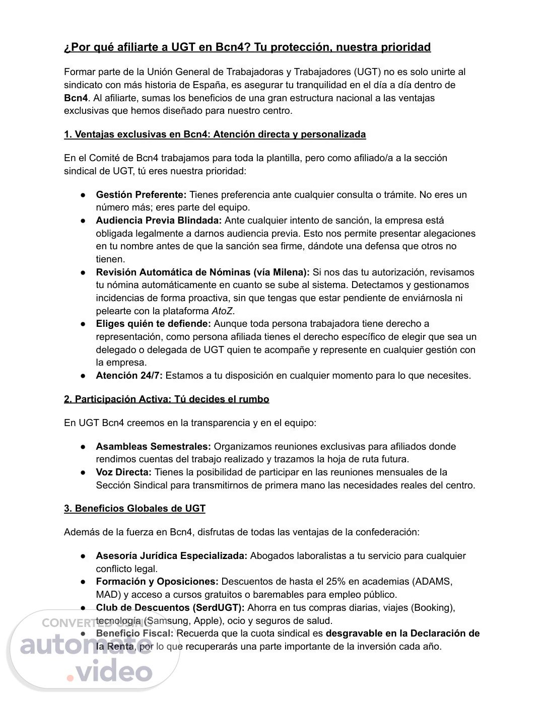 ¿Por qué afiliarte a UGT en Bcn4? Tu protección, nuestra prioridad Formar parte de la Unión General de Trabajadoras y Trabajadores (UGT) no es solo unirte al sindicato con más historia de España, es asegurar tu tranquilidad en el día a día dentro de Bcn4. Al afiliarte, sumas los beneficios de una gran estructura nacional a las ventajas exclusivas que hemos diseñado para nuestro centro. 1. Ventajas exclusivas en Bcn4: Atención directa y personalizada En el Comité de Bcn4 trabajamos para toda la plantilla, pero como afiliado/a a la sección sindical de UGT, tú eres nuestra prioridad: ● Gestión Preferente: Tienes preferencia ante cualquier consulta o trámite. No eres un número más; eres parte del equipo. ● Audiencia Previa Blindada: Ante cualquier intento de sanción, la empresa está obligada legalmente a darnos audiencia previa. Esto nos permite presentar alegaciones en tu nombre antes de que la sanción sea firme, dándote una defensa que otros no tienen. ● Revisión Automática de Nóminas (vía Milena): Si nos das tu autorización, revisamos tu nómina automáticamente en cuanto se sube al sistema. Detectamos y gestionamos incidencias de forma proactiva, sin que tengas que estar pendiente de enviárnosla ni pelearte con la plataforma AtoZ. ● Eliges quién te defiende: Aunque toda persona trabajadora tiene derecho a representación, como persona afiliada tienes el derecho específico de elegir que sea un delegado o delegada de UGT quien te acompañe y represente en cualquier gestión con la empresa. ● Atención 24/7: Estamos a tu disposición en cualquier momento para lo que necesites. 2. Participación Activa: Tú decides el rumbo En UGT Bcn4 creemos en la transparencia y en el equipo: ● Asambleas Semestrales: Organizamos reuniones exclusivas para afiliados donde rendimos cuentas del trabajo realizado y trazamos la hoja de ruta futura. ● Voz Directa: Tienes la posibilidad de participar en las reuniones mensuales de la Sección Sindical para transmitirnos de primera mano las necesidades reales del centro. 3. Beneficios Globales de UGT Además de la fuerza en Bcn4, disfrutas de todas las ventajas de la confederación: ● Asesoría Jurídica Especializada: Abogados laboralistas a tu servicio para cualquier conflicto legal. ● Formación y Oposiciones: Descuentos de hasta el 25% en academias (ADAMS, MAD) y acceso a cursos gratuitos o baremables para empleo público. ● Club de Descuentos (SerdUGT): Ahorra en tus compras diarias, viajes (Booking), tecnología (Samsung, Apple), ocio y seguros de salud. ● Beneficio Fiscal: Recuerda que la cuota sindical es desgravable en la Declaración de la Renta, por lo que recuperarás una parte importante de la inversión cada año..