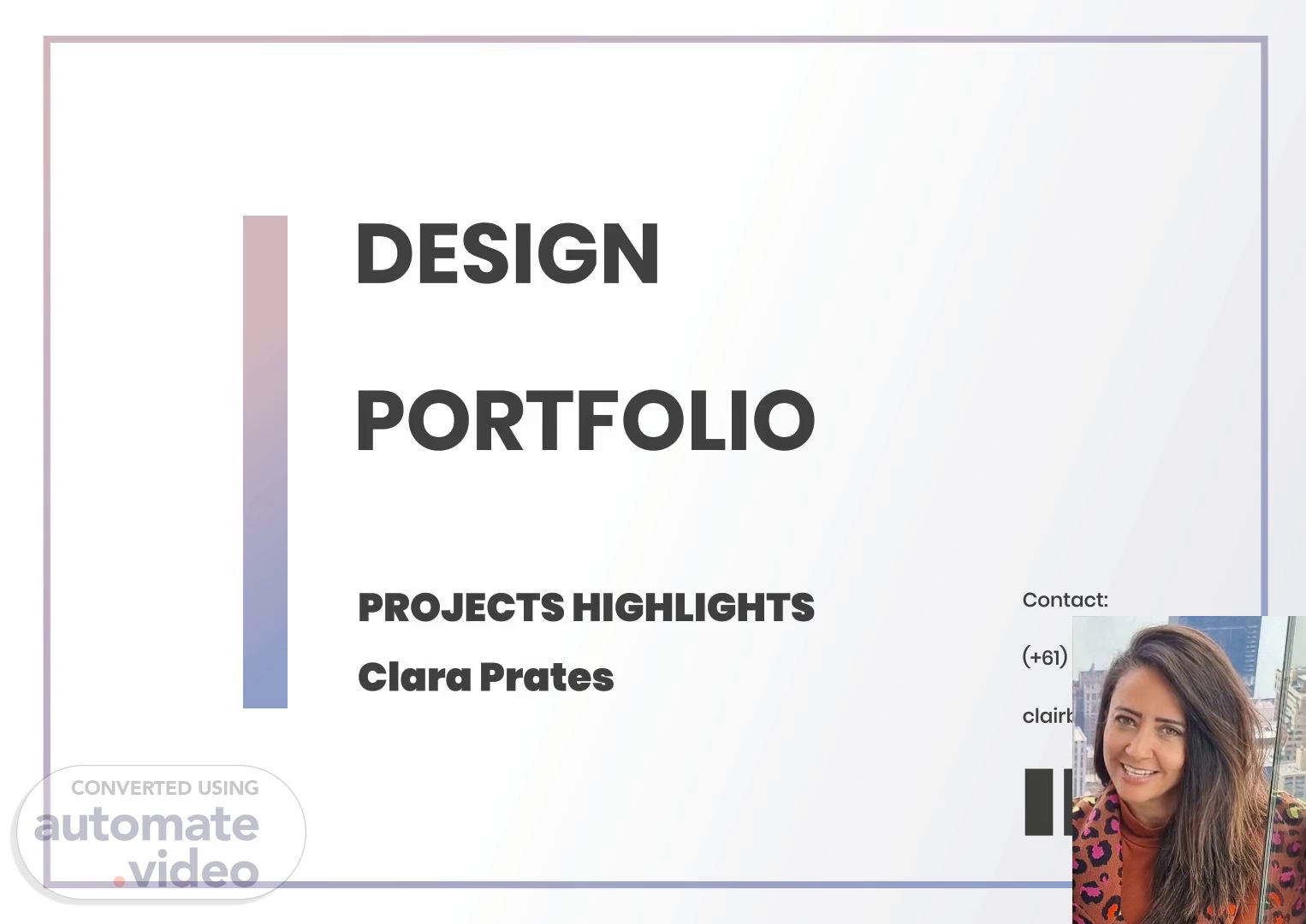 [Audio] I am excited to share with you my passion for design and how I bring brands to life through my work. My portfolio showcases a range of projects, from corporate identities to vibrant promotional materials. I have always been fascinated by the way design can impact people's emotions and behaviors. As a designer, I strive to create solutions that are both aesthetically pleasing and effective. I believe that good design should be simple yet powerful, and I aim to achieve this balance in all my work. I am proud to share my portfolio with you today, and I hope you will find inspiration in my designs..
