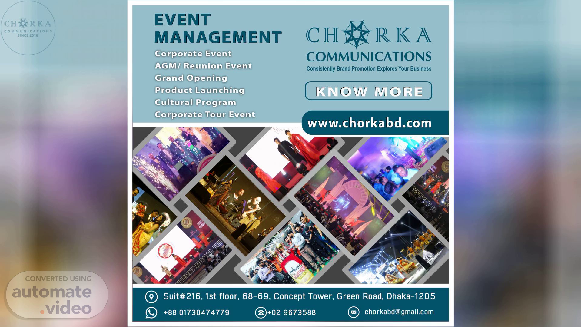 [Audio] . EVENT MANAGEMENT Corporate Event AGM/ Reunion Event Grand Opening Product Launching Cultural Program Corporate Tour Event COMMUNICATIONS Consistently Brand Promotion Explores Your Business www.chorkabd.com SUit#216, 1st floor, 68-69, Concept Tower, Green Road, Dhaka-1205 +88 01730474779 R +02 9673588 [email protected].