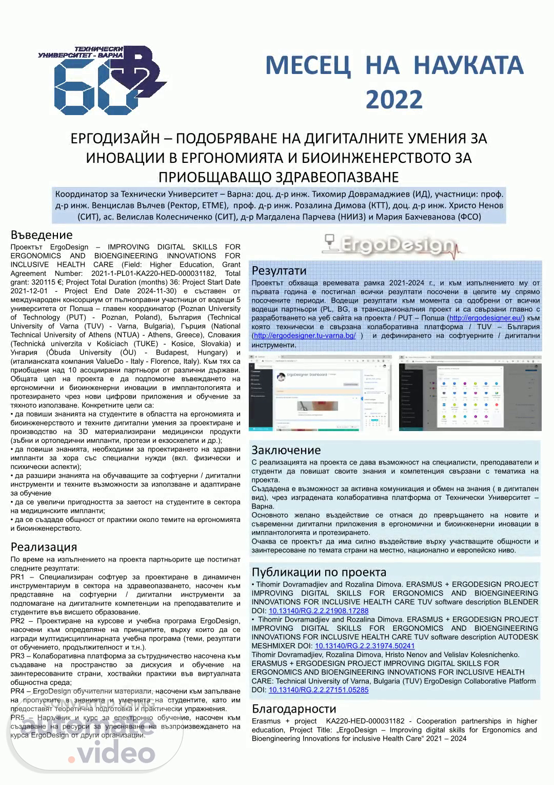 ЕРГОДИЗАЙН – ПОДОБРЯВАНЕ НА ДИГИТАЛНИТЕ УМЕНИЯ ЗА ИНОВАЦИИ В ЕРГОНОМИЯТА И БИОИНЖЕНЕРСТВОТО ЗА ПРИОБЩАВАЩО ЗДРАВЕОПАЗВАНЕ Въведение Проектът ErgoDesign – IMPROVING DIGITAL SKILLS FOR ERGONOMICS AND BIOENGINEERING INNOVATIONS FOR INCLUSIVE HEALTH CARE (Field: Higher Education, Grant Agreement Number: 2021-1-PL01-KA220-HED-000031182, Total grant: 320115 €; Project Total Duration (months) 36: Project Start Date 2021-12-01 - Project End Date 2024-11-30) e съставен от международен консорциум от пълноправни участници от водещи 5 университета от Полша – главен коордкинатор (Poznan University of Technology (PUT) - Poznan, Poland), България (Technical University of Varna (TUV) - Varna, Bulgaria), Гърция (National Technical University of Athens (NTUA) - Athens, Greece), Словакия (Technická univerzita v Košiciach (TUKE) - Kosice, Slovakia) и Унгария (Óbuda University (ÓU) - Budapest, Hungary) и (италианската компания ValueDo - Italy - Florence, Italy). Към тях са приобщени над 10 асоциирани партньори от различни държави. Общата цел на проекта е да подпомогне въвеждането на ергономични и биоинженерни иновации в имплантологията и протезирането чрез нови цифрови приложения и обучение за Резултати Проектът обхваща времевата рамка 2021-2024 г., и към изпълнението му от първата година е постигнал всички резултати посочени в целите му спрямо посочените периоди. Водещи резултати към момента са одобрени от всички водещи партньори (PL, BG, в трансцанионалния проект и са свързани главно с разработването на уеб сайта на проекта / PUT – Полша (http://ergodesigner.eu/) към която технически е свързана колаборативна платформа / TUV – България (http://ergodesigner.tu-varna.bg/ ) и дефинирането на софтуерните / дигитални инструменти. МЕСЕЦ НА НАУКАТА 2022 Координатор за Технически Университет – Варна: доц. д-р инж. Тихомир Доврамаджиев (ИД), участници: проф. д-р инж. Венцислав Вълчев (Ректор, ЕТМЕ), проф. д-р инж. Розалина Димова (КТТ), доц. д-р инж. Христо Ненов (СИТ), ас. Велислав Колесниченко (СИТ), д-р Магдалена Парчева (НИИ3) и Мария Бахчеванова (ФСО) Благодарности Erasmus + project KA220-HED-000031182 - Cooperation partnerships in higher education, Project Title: „ErgoDesign – Improving digital skills for Ergonomics and Bioengineering Innovations for inclusive Health Care“ 2021 – 2024 протезирането чрез нови цифрови приложения и обучение за тяхното използване. Конкретните цели са: • да повиши знанията на студентите в областта на ергономията и биоинженерството и техните дигитални умения за проектиране и производство на 3D материализирани медицински продукти (зъбни и ортопедични импланти, протези и екзоскелети и др.); • да повиши знанията, необходими за проектирането на здравни импланти за хора със специални нужди (вкл. физически и психически аспекти); • да разшири знанията на обучаващите за софтуерни / дигитални инструменти и техните възможности за използване и адаптиране за обучение • да се увеличи пригодността за заетост на студентите в сектора на медицинските импланти; • да се създаде общност от практики около темите на ергономията и биоинженерството. Заключение С реализацията на проекта се дава възможност на специалисти, преподаватели и студенти да повишат своите знания и компетенция свързани с тематика на проекта. Създадена е възможност за активна комуникация и обмен на знания ( в дигитален вид), чрез изградената колаборативна платформа от Технически Университет – Варна. Основното желано въздействие се отнася до превръщането на новите и съвременни дигитални приложения в ергономични и биоинженерни иновации в имплантологията и протезирането. Очаква се проектът да има силно въздействие върху участващите общности и заинтересоване по темата страни на ме