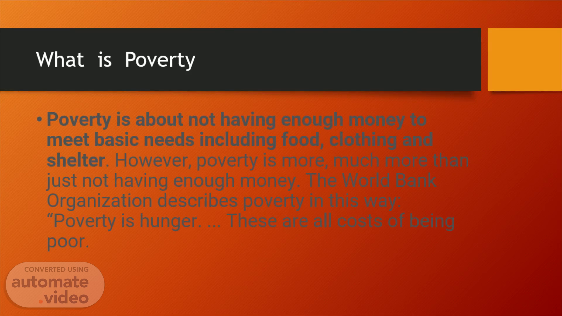 What is Poverty. Poverty is about not having enough money to meet basic needs including food, clothing and shelter . However, poverty is more, much more than just not having enough money. The World Bank Organization describes poverty in this way: “Poverty is hunger. ... These are all costs of being poor..