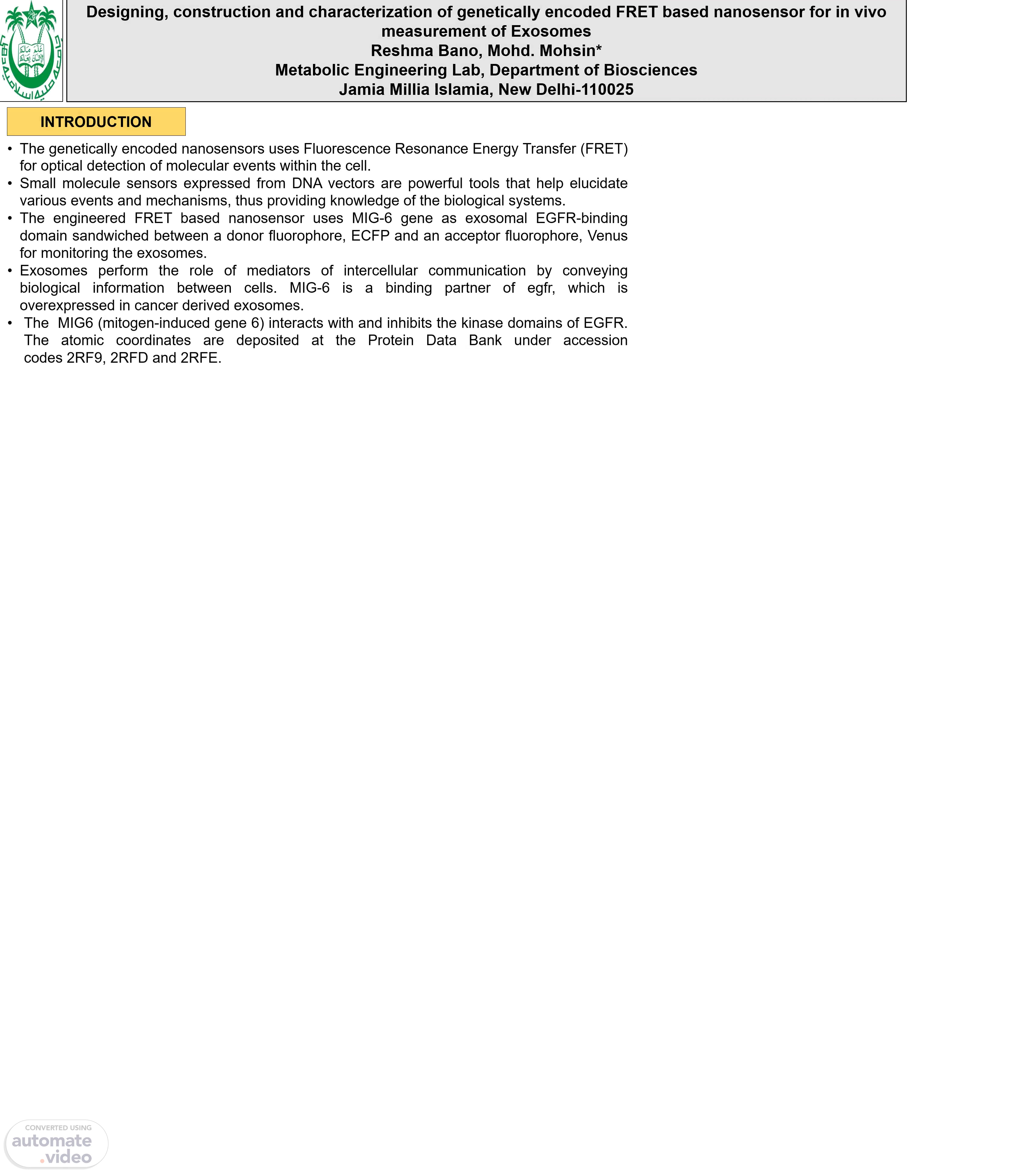 Designing , construction and characterization of genetically encoded FRET based nanosensor for in vivo measurement of Exosomes Reshma Bano , Mohd . Mohsin * Metabolic Engineering Lab, Department of Biosciences Jamia Millia Islamia , New Delhi-110025.