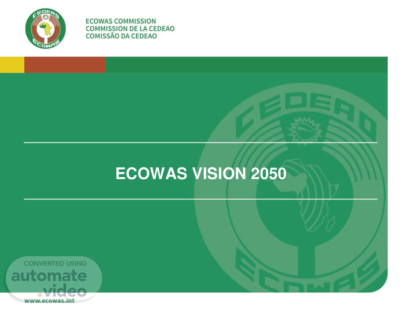 . . ECOWAS COMMISSION COMMISSION DE LA CEDEAO COMISSÄO DA CEDEAO Conditions For Success VISION 2050 Availability Documents of Operational Institutional 1. 2. 3. 4. 5. Guiding Principles Leadership & Political Will Ownership and Shared Responsibility Complementarity et Subsidiarity Transparency and Accountablity Sustainability www.ecowas.int 1. 1. 2. 3. 4. Success Factors Effective and Conducive Framework Resource Mobilisation, Cooperation and Strategic Partnerships Programming, Monitoring and Evaluation Strategic Surveillance Advocacy, Communication and Awareness.