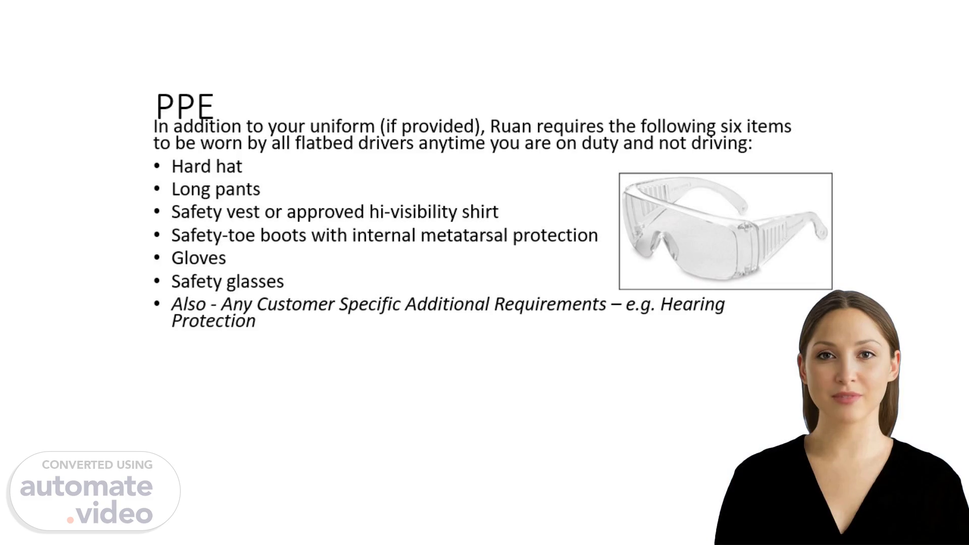 [Virtual Presenter] As Ruan flatbed drivers, it's important to make sure you are wearing the right protective equipment while you're on duty. This means a hard hat, long pants, a safety vest or an approved hi-visibility shirt, safety-toe boots with internal metatarsal protection, gloves, safety glasses and any customer-specific additional requirements that may be required. Keep yourself safe and make sure you always wear the right PPE..