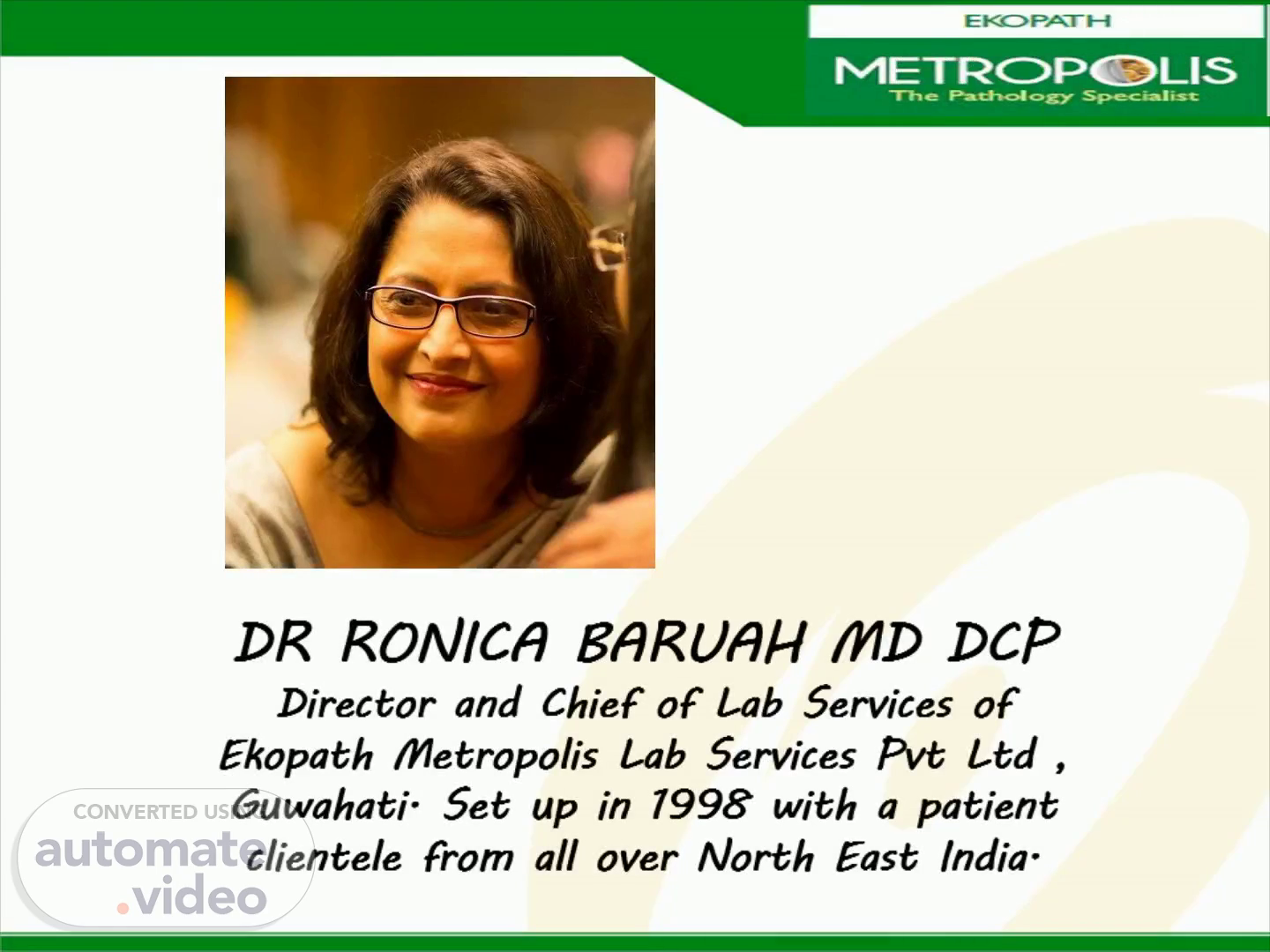 Ekopath Metropolis New Logo. DR RONICA BARUAH MD DCP Director and Chief of Lab Services of Ekopath Metropolis Lab Services Pvt Ltd , Guwahati. Set up in 1998 with a patient clientele from all over North East India..