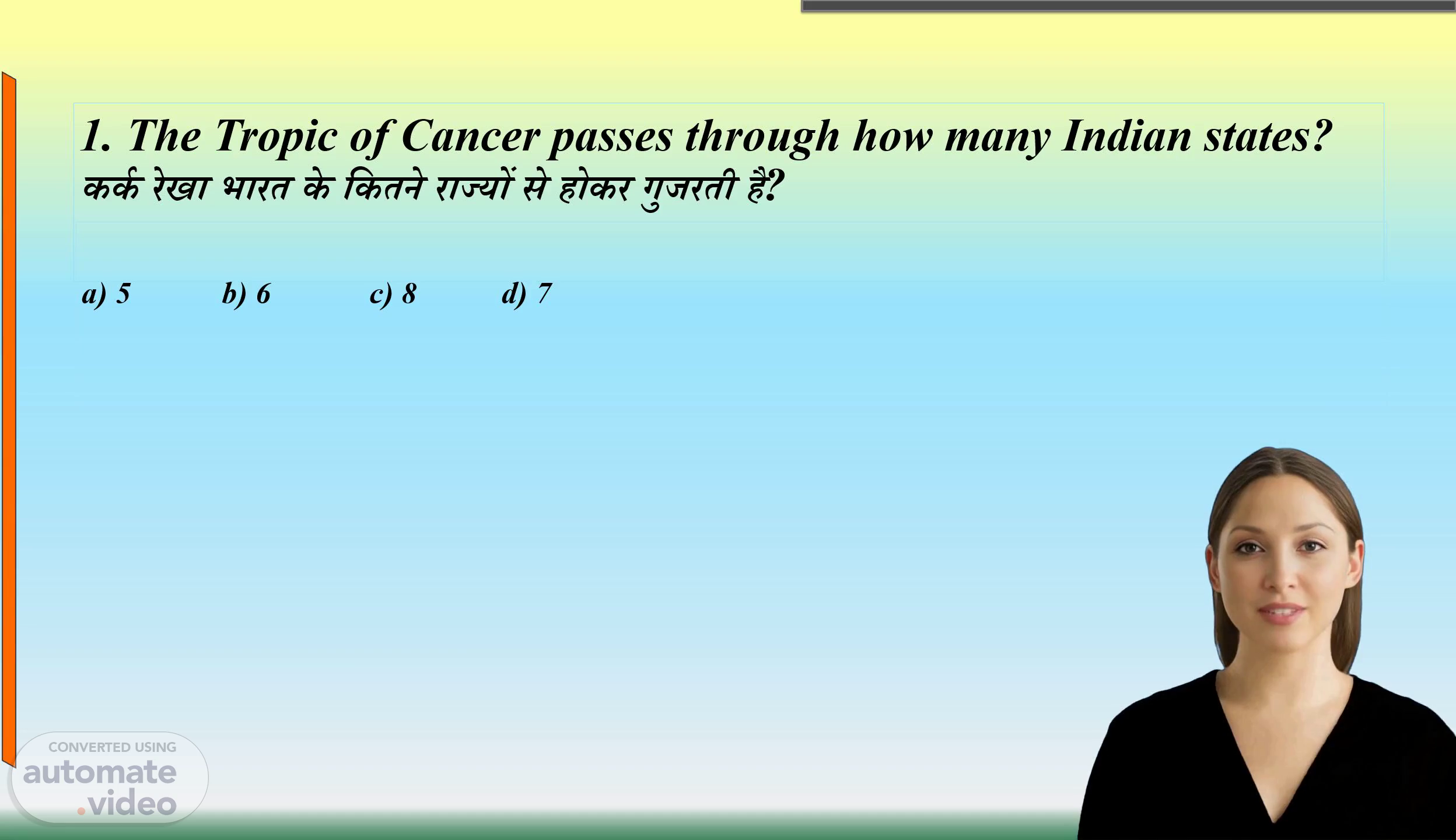 [Virtual Presenter] नमस्ते और स्वागत है। मेरा नाम है और मैं आपके शिक्षक हूं। यह पाठ्यक्रम का शीर्षक है 'कर्क रेखा भारत के कितने राज्यों से होकर गुजरती है?' चलिए हम पहले स्लाइड पर बढ़ते हैं। और जानते हैं कि भारत में कर्क रेखा कितने राज्यों से गुजरती है।.