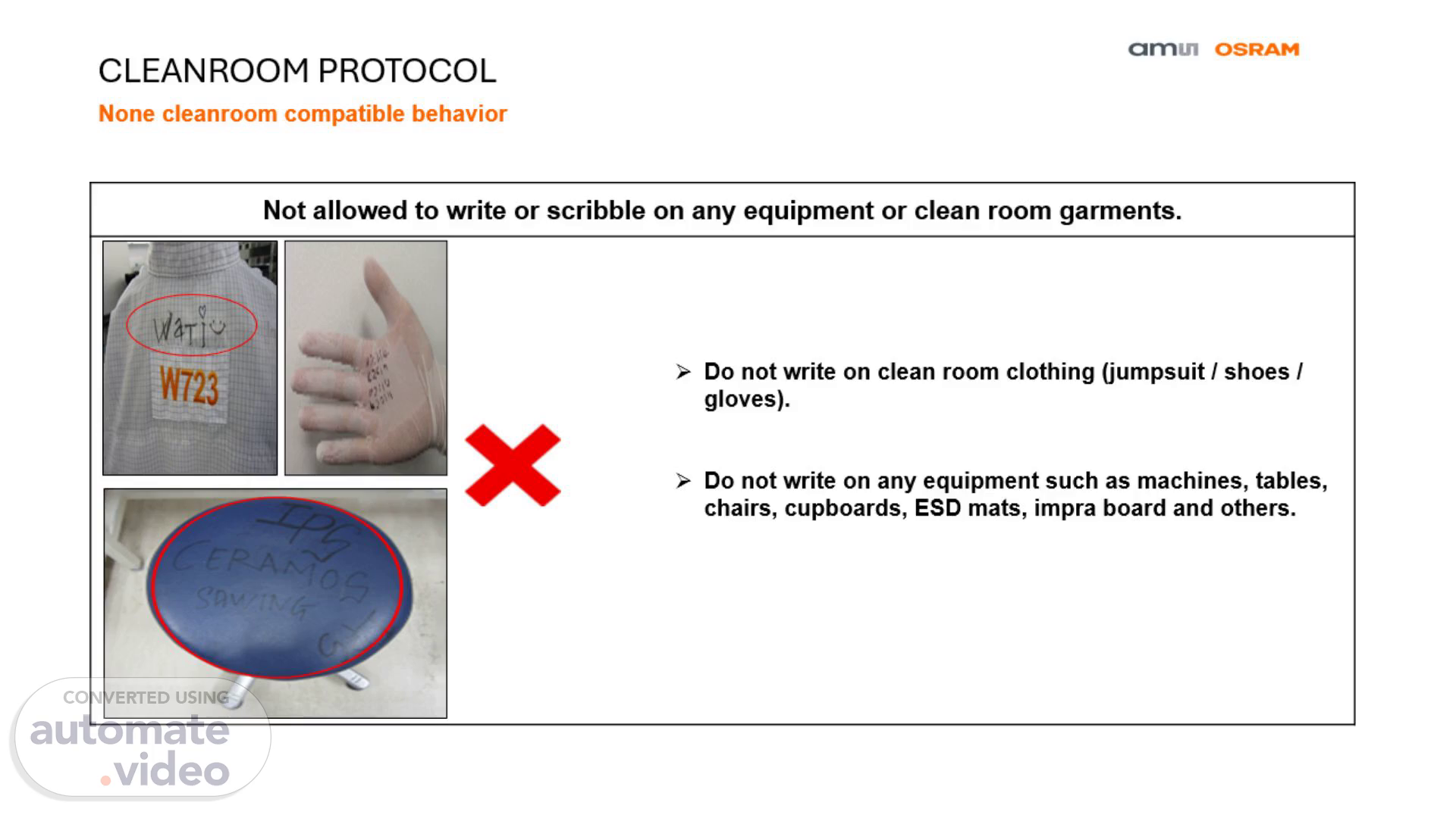 [Audio] Rule 8. Not allowed to write or scribble on any equipment or cleanroom garments. Do not write on clean room clothing (jumpsuit / shoes / gloves). Do not write on any equipment such as machines, tables, chairs, cupboards, ESD mats and others..