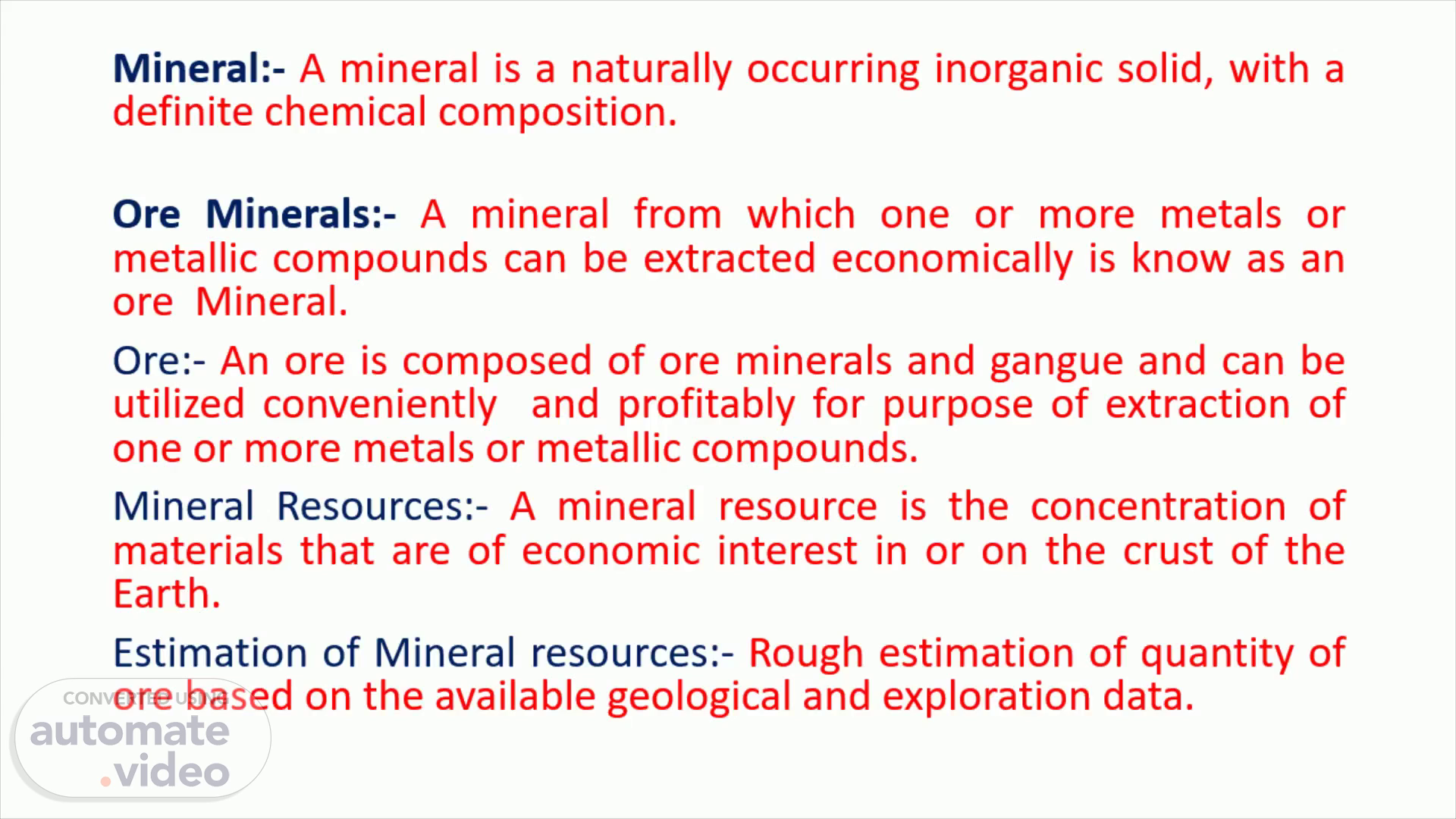 Mineral:- A mineral is a naturally occurring inorganic solid, with a definite chemical composition. Ore Minerals:- A mineral from which one or more metals or metallic compounds can be extracted economically is know as an ore Mineral. Ore:- An ore is composed of ore minerals and gangue and can be utilized conveniently and profitably for purpose of extraction of one or more metals or metallic compounds. Mineral Resources:- A mineral resource is the concentration of materials that are of economic interest in or on the crust of the Earth. Estimation of Mineral resources:- Rough estimation of quantity of ore based on the available geological and exploration data..