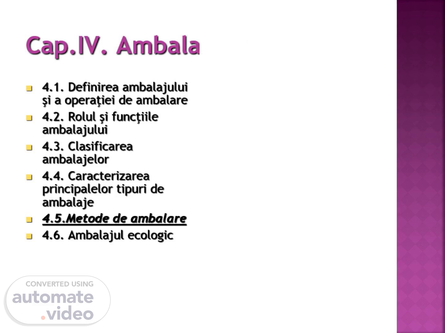 Cap.IV. Ambalarea mărfurilor. 4.1. Definirea ambalajului şi a operaţiei de ambalare 4.2. Rolul şi funcţiile ambalajului 4.3. Clasificarea ambalajelor 4.4. Caracterizarea principalelor tipuri de ambalaje 4.5.Metode de ambalare 4.6. Ambalajul ecologic.