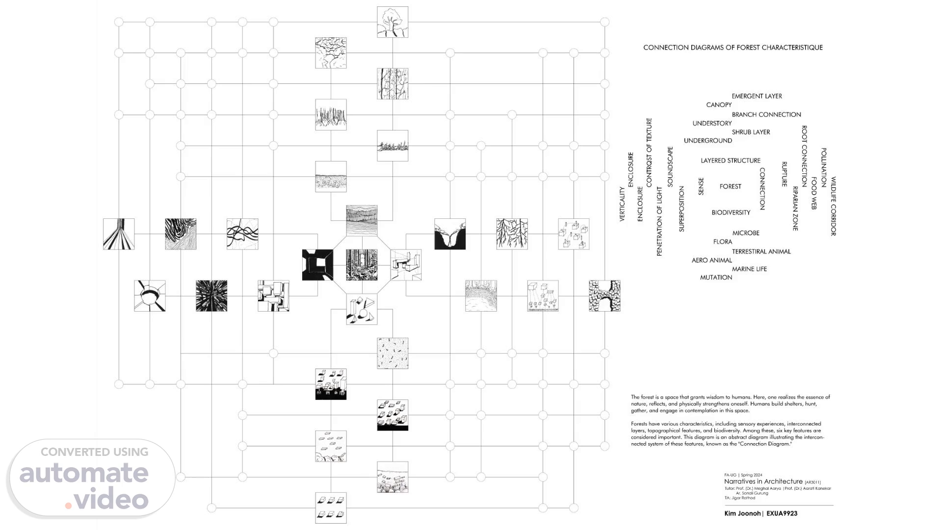 [Audio] The nature of BHU was created following the morphology of BHU itself. Trees lining the roads, trees placed at intersections, and abandoned trees with ponds. Students live within BHU without experiencing the freedom that nature provides. The goal of this project is to create architectural spaces resembling forests within BHU, where students can freely explore and grow. So, the first step taken for this project was to understand the characteristics of a forest. In this Matrix Diagram, forests have four major characteristics: Layered Structure, Sense, Biodiversity, and Connection. Beneath these major characteristics lie smaller features, and these features influence each other..