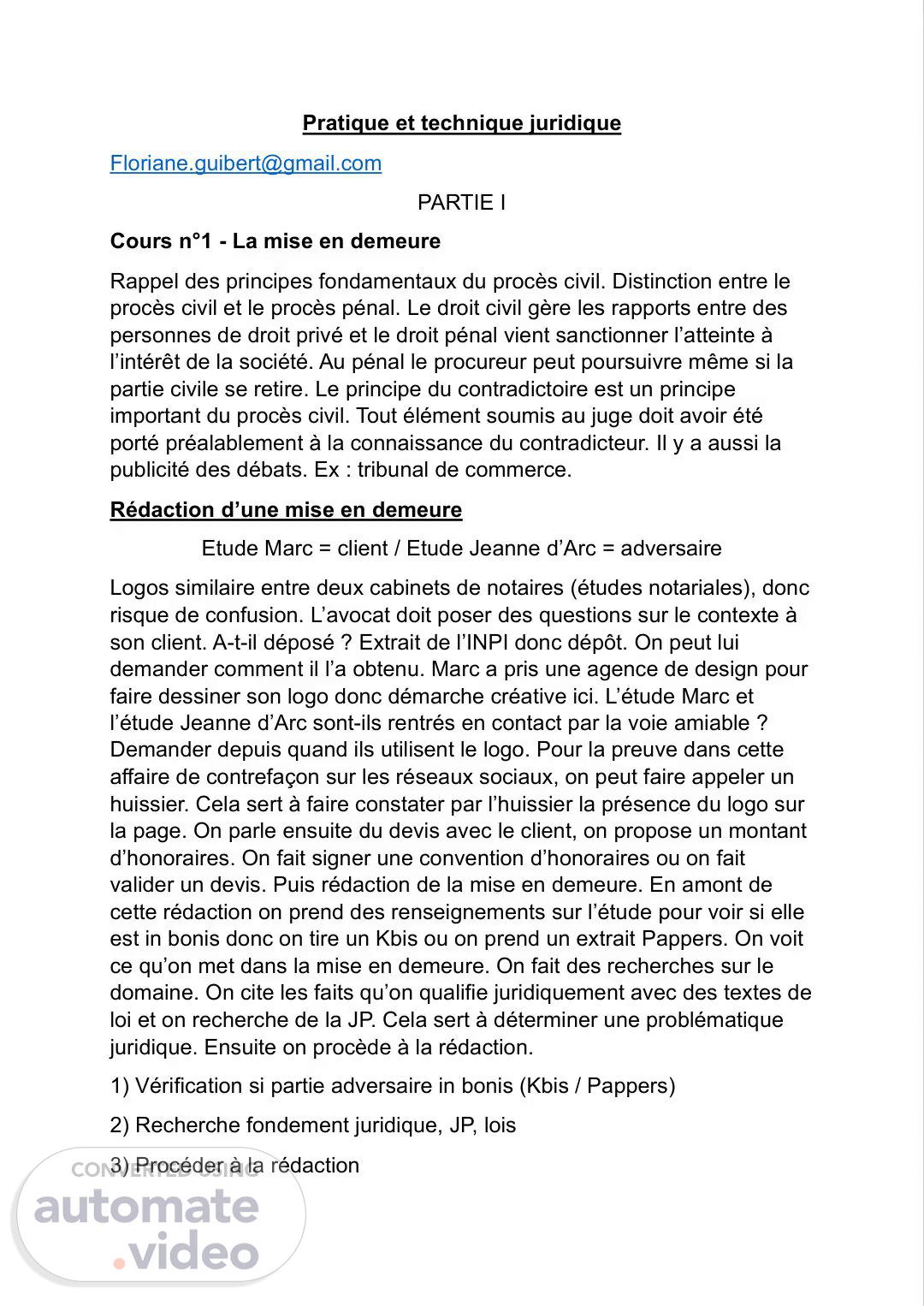 Pratique et technique juridique [email protected] PARTIE I Cours n°1 - La mise en demeure Rappel des principes fondamentaux du procès civil. Distinction entre le procès civil et le procès pénal. Le droit civil gère les rapports entre des personnes de droit privé et le droit pénal vient sanctionner l’atteinte à l’intérêt de la société. Au pénal le procureur peut poursuivre même si la partie civile se retire. Le principe du contradictoire est un principe important du procès civil. Tout élément soumis au juge doit avoir été porté préalablement à la connaissance du contradicteur. Il y a aussi la publicité des débats. Ex : tribunal de commerce. Rédaction d’une mise en demeure Etude Marc = client / Etude Jeanne d’Arc = adversaire Logos similaire entre deux cabinets de notaires (études notariales), donc risque de confusion. L’avocat doit poser des questions sur le contexte à son client. A-t-il déposé ? Extrait de l’INPI donc dépôt. On peut lui demander comment il l’a obtenu. Marc a pris une agence de design pour faire dessiner son logo donc démarche créative ici. L’étude Marc et l’étude Jeanne d’Arc sont-ils rentrés en contact par la voie amiable ? Demander depuis quand ils utilisent le logo. Pour la preuve dans cette affaire de contrefaçon sur les réseaux sociaux, on peut faire appeler un huissier. Cela sert à faire constater par l’huissier la présence du logo sur la page. On parle ensuite du devis avec le client, on propose un montant d’honoraires. On fait signer une convention d’honoraires ou on fait valider un devis. Puis rédaction de la mise en demeure. En amont de cette rédaction on prend des renseignements sur l’étude pour voir si elle est in bonis donc on tire un Kbis ou on prend un extrait Pappers. On voit ce qu’on met dans la mise en demeure. On fait des recherches sur le domaine. On cite les faits qu’on qualifie juridiquement avec des textes de loi et on recherche de la JP. Cela sert à déterminer une problématique juridique. Ensuite on procède à la rédaction. 1) Vérification si partie adversaire in bonis (Kbis / Pappers) 2) Recherche fondement juridique, JP, lois 3) Procéder à la rédaction.