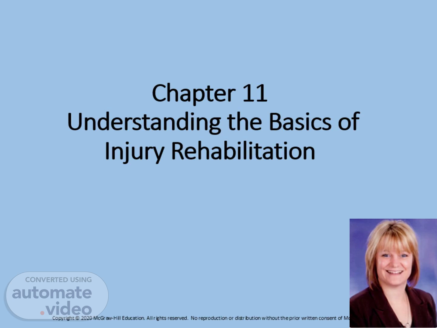 [Audio] Chapter 11 of our presentation will cover the Basics of Injury Rehabilitation, specifically the difference between Therapeutic Exercise and Conditioning Exercise. Therapeutic exercise consists of specific exercises designed to aid in the recovery of an injury and is tailored to the individual needs of the patient. On the other hand, conditioning exercise focuses on improving performance while minimizing the risk of injury. It is important to note that state laws limit who can legally supervise or design a rehabilitation program. Typically, only licensed healthcare providers are allowed to do so as they have a thorough understanding of the individual's injury and recovery needs. Therefore, it is crucial to have a licensed healthcare provider involved in the design and supervision of a rehabilitation program to ensure safety and compliance with regulations. Understanding the difference between Therapeutic Exercise and Conditioning Exercise is essential for creating a successful rehabilitation program. Only licensed healthcare providers have the expertise to design and supervise these programs. Our discussion on Injury Rehabilitation will continue in the following slides..