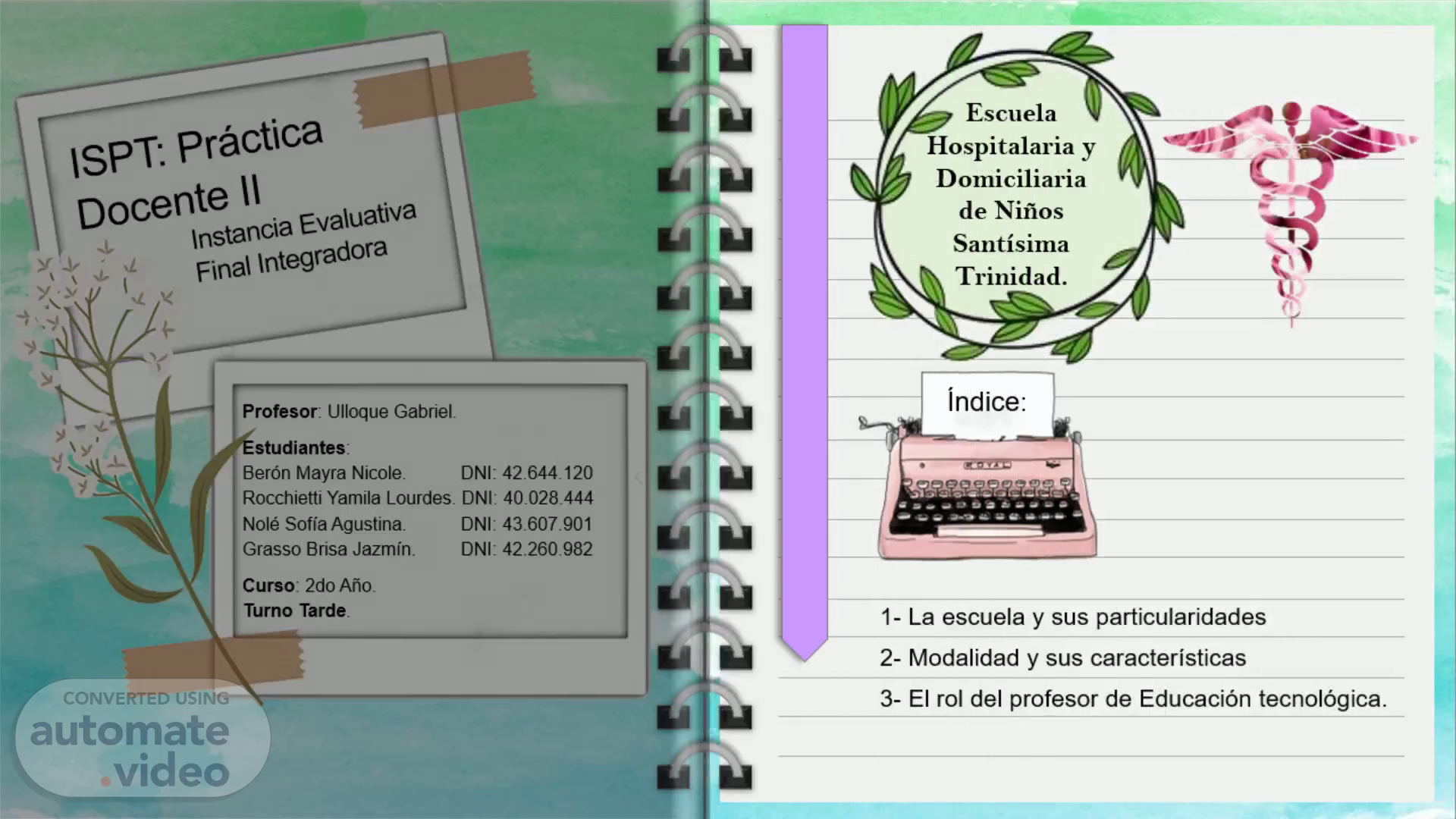 ISPT: Práctica Docente II Instancia Evaluativa Final Integradora Profesor : Ulloque Gabriel. Estudiantes : Berón Mayra Nicole. DNI : 42.644.120 Rocchietti Yamila Lourdes. DNI : 40.028.444 Nolé Sofía Agustina. DNI : 43.607.901 Grasso Brisa Jazmín. DNI: 42.260.982 Curso : 2do Año. Turno Tarde . 2 - Modalidad y sus características 1- La escuela y sus particularidades 3- El rol del profesor de Educación tecnológica. Índice:.