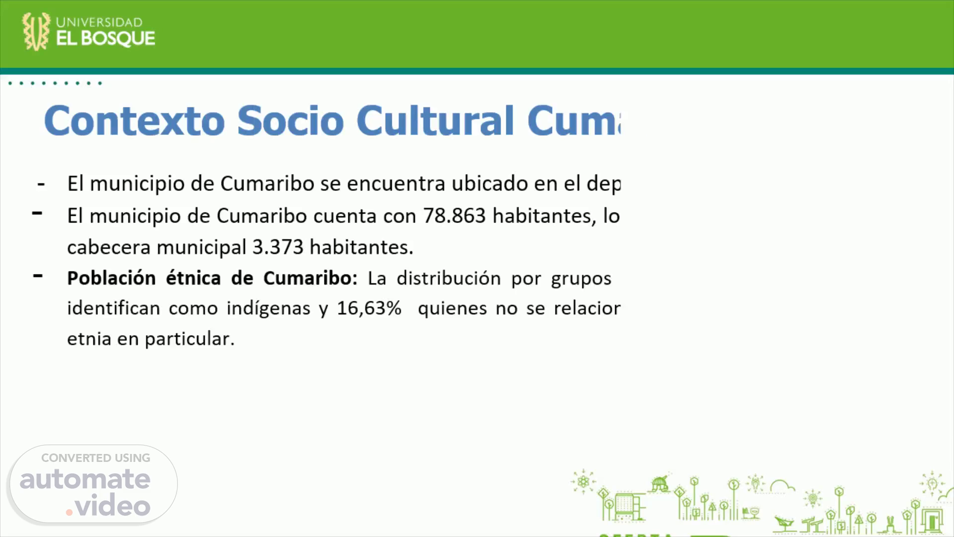 Contexto Socio Cultural Cumaribo Vichada El municipio de Cumaribo se encuentra ubicado en el departamento del Vichada. El municipio de Cumaribo cuenta con 78.863 habitantes, los cuales se ubican 4,28% en la cabecera municipal 3.373 habitantes. Población étnica de Cumaribo: La distribución por grupos étnicos es de 83% quienes se identifican como indígenas y 16,63% quienes no se relacionan o no corresponde a alguna etnia en particular..