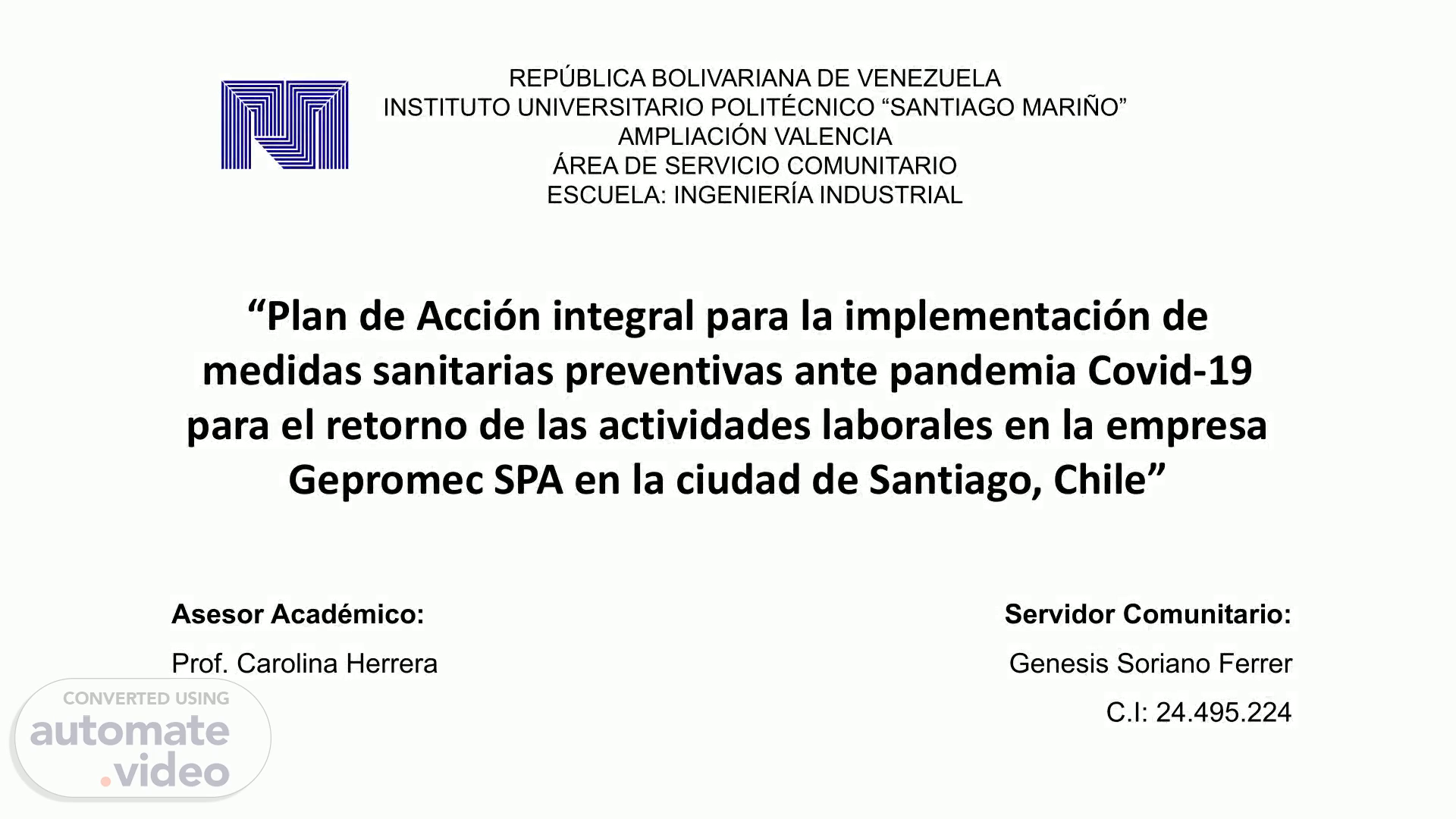 REPÚBLICA BOLIVARIANA DE VENEZUELA INSTITUTO UNIVERSITARIO POLITÉCNICO “SANTIAGO MARIÑO” AMPLIACIÓN VALENCIA ÁREA DE SERVICIO COMUNITARIO ESCUELA: INGENIERÍA INDUSTRIAL “Plan de Acción integral para la implementación de medidas sanitarias preventivas ante pandemia Covid-19 para el retorno de las actividades laborales en la empresa Gepromec SPA en la ciudad de Santiago, Chile” Asesor Académico: Prof. Carolina Herrera Servidor Comunitario: Genesis Soriano Ferrer C.I: 24.495.224.