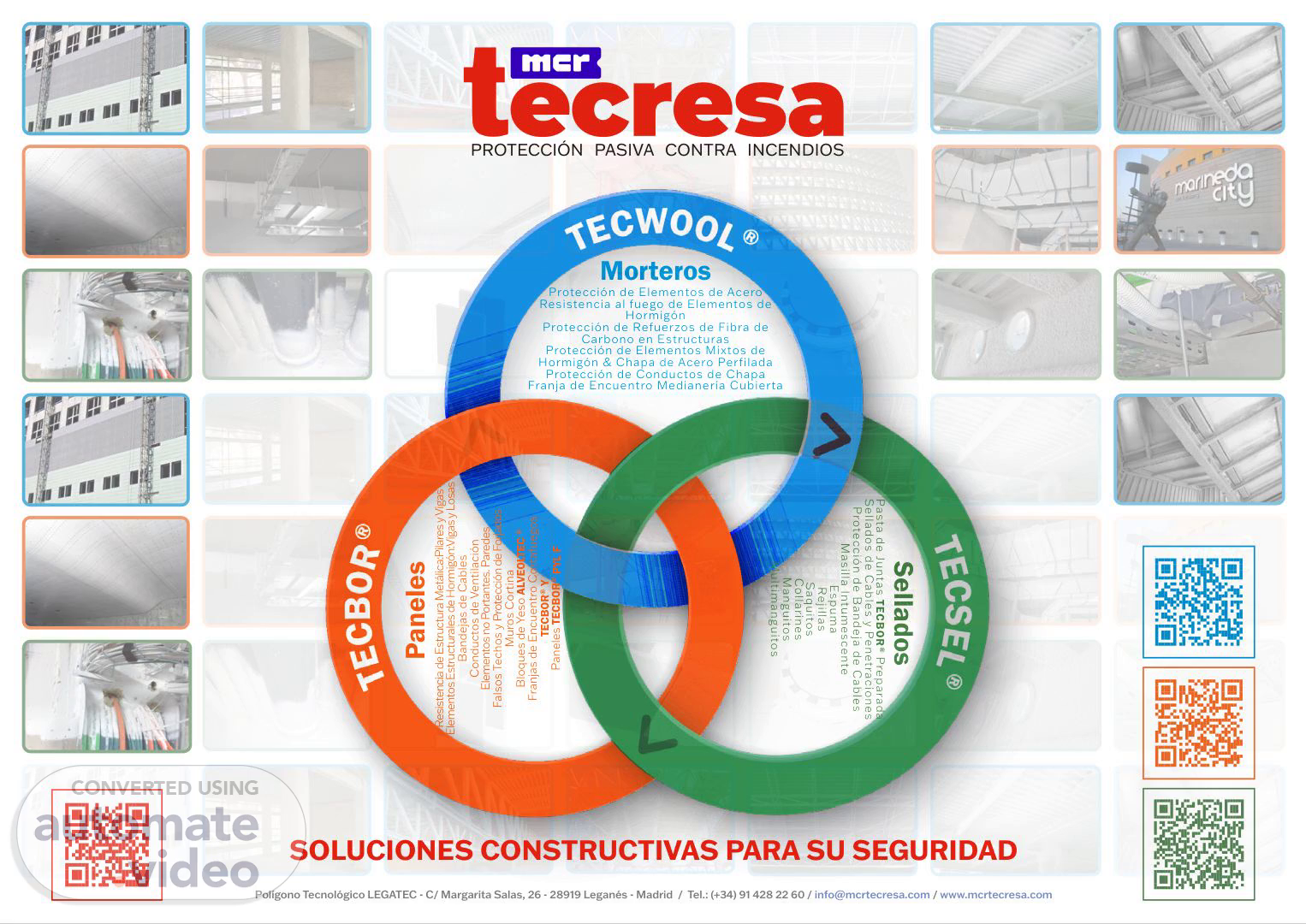 02 Polígono Tecnológico LEGATEC - C/ Margarita Salas, 26 - 28919 Leganés - Madrid / Tel.: (+34) 91 428 22 60 / [email protected] / www.mcrtecresa.com PERFIL DE EMPRESA mcr tecresa® es una empresa de reciente creación (mayo de 2025) fruto de la escisión de Tecresa Protección Pasiva, compañía fundada el 24 de julio de 1998 y con más de 25 años de trayectoria en el sector de la protección pasiva contra incendios. Gracias a esta continuidad, mcr tecresa® mantiene la misma experiencia, conocimiento técnico y equipo profesional que ha acompañado a nuestros clientes desde 1998, pero con una estructura renovada y enfocada en ofrecer un servicio aún más especializado y competitivo. En esencia, seguimos siendo los mismos profesionales de confianza que llevan más de dos décadas en el sector, ahora operando bajo una nueva organización que nos permite responder mejor a las necesidades actuales del mercado. Nació con el fin de ofrecer, tanto al mercado nacional como al internacional, las soluciones integrales más avanzadas para la protección pasiva contra incendios, centrándose en resistencia al fuego de materiales, con productos de fabricación propia como son el Mortero TECWOOL®, los Paneles TECBOR® o los Sellados TECSEL®. Nuestro objetivo principal es satisfacer las necesidades que el cambiante y competitivo mercado demanda en la actualidad, aportando soluciones que no se circunscriben únicamente al desarrollo y comercialización de material de protección contra el fuego, sino que, con un enfoque más amplio, permiten a sus clientes optimizar su gestión, clave de la competitividad. mcr tecresa® esta afianzado su liderazgo en el sector a base de dedicación, tecnología y desarrollo de sistemas para la protección de incendios. mcr tecresa® estamos en continua evolución y desarrollo, buscando como fin último poder mejorar día a día el servicio que ofrecemos a nuestros clientes..