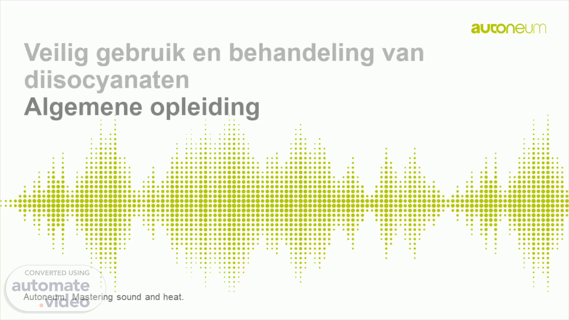 [Audio] Hallo allemaal, volgens de nieuwe richtlijnen van de Europese unie gaan we iedereen die in contact komt met di-isocyanaten een opleiding geven gaande van, wat zijn diisocyanaten, hoe gaan we ermee om, en hoe beschermen we ons. Let wel even op, deze opleiding gaat over di-isocyanaten niet te verwarren met trennmiddel gebruikt in de lijnen. Ons produktie proces binnen autoneum is zodanig opgebouwd dat een operator op zijn maximum is beschermd doordat de fusie met iso en polyol in een gesloten omgeving gebeurd, of zoals bij de rast in een open omgeving, maar beschermd achteraan afgesloten met hekwerk ver weg van de operator..
