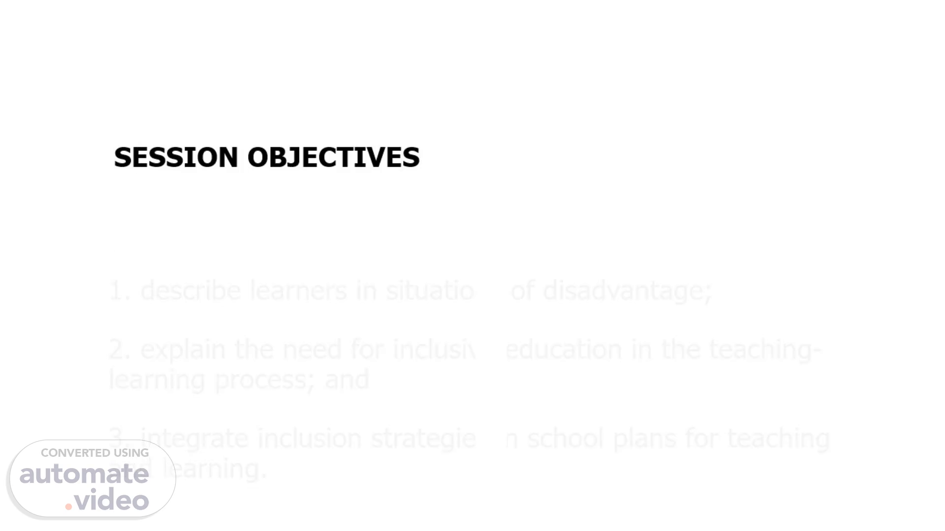 1. describe learners in situations of disadvantage; 2. explain the need for inclusive education in the teaching-learning process; and 3. integrate inclusion strategies in school plans for teaching and learning..