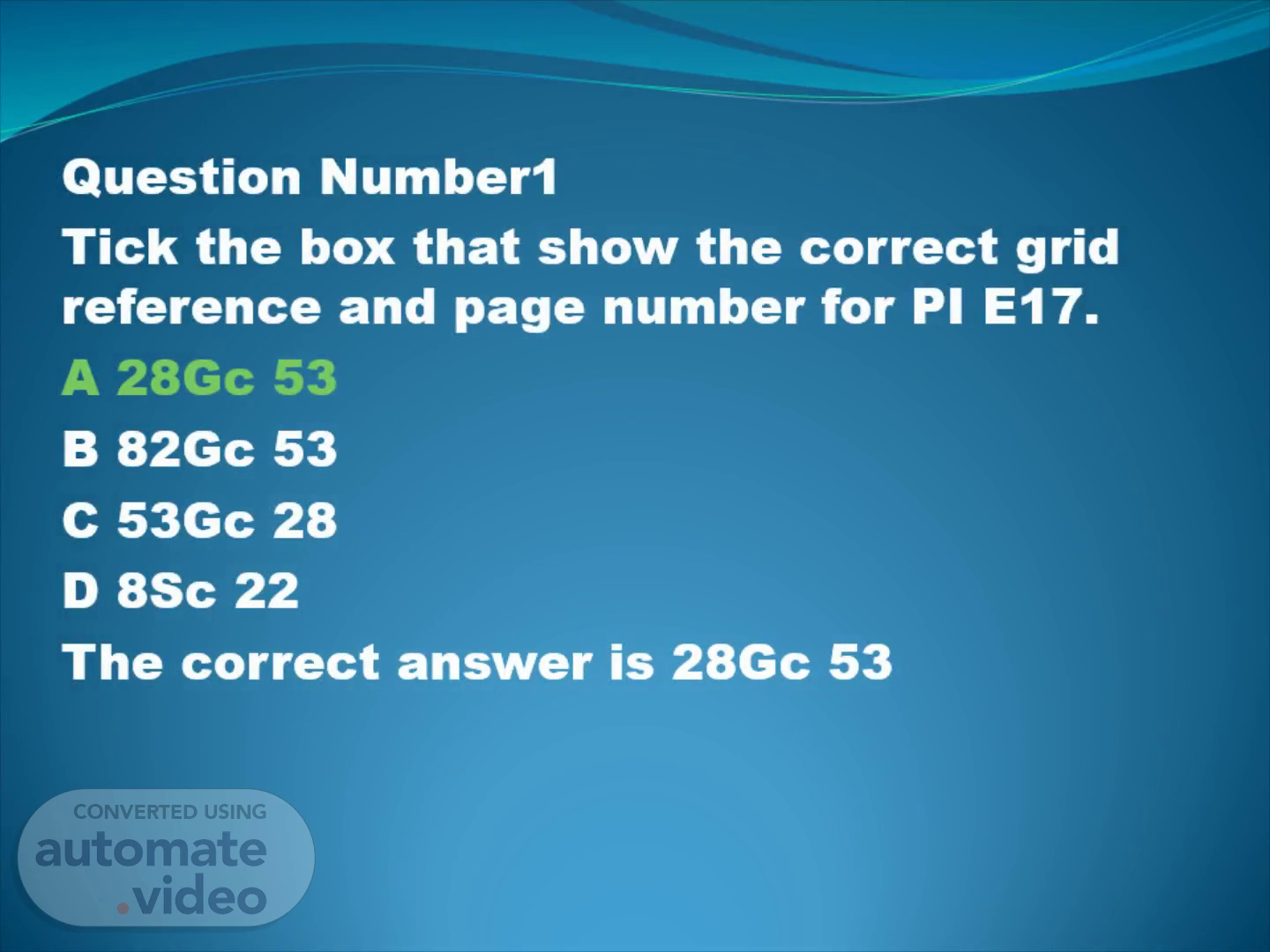 Question Number1 Tick the box that show the correct grid reference and page number for PI E17. A 28Gc 53 B 82Gc 53 C 53Gc 28 D 8Sc 22 The correct answer is 28Gc 53.