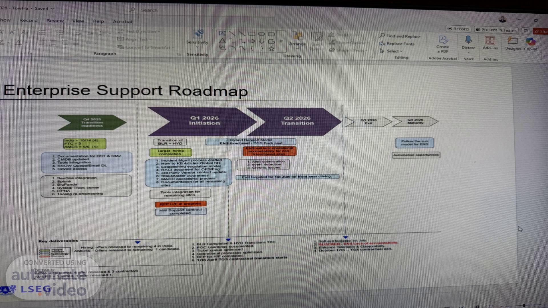[Audio] . hievernents 2026 - TowHa •s Savedia Slide Show Select Editing Record Present in Te t*ctateT Add-ins PDF -Adobe Acrobat a Voike g AAAGdÅiris' Paragraph ENS Team achievementS Infrastructure wins: Proactive audits of au Enterprise estate e;- Identified issue"Udhias apacity, bottlenecks & SPOF conditions. tene in DC locations impacting rnultiple sites. Design Limitations in EMEA — Farham and Slough ign„ kylie/ BLR — We have identified bottlenecks and fix in progresS. Config standardisation for Milan ,Madrid , N ottingharfi n Executive visit Suc ess: Hypercare for: • BLR David & Pascal's town halls. Hyderabad — Pascal's Visit & inauguration Of new site Bucharest Irfan'S visit. Process wins: Enterprise Triage process established for Ops Tea WIFI troubleshooting checklist, published- SOP for legb>acincluding detailed troubleshooting ier.i s Incident and change rnanagement process for enterpriS O p ete Observabilitywins; Reduced noise signa rat o for ENS ate Added itoring ACLsM) Geneva & Mani to: Transition wins: BLR (DST/RMZ) — Transitioned to ENS HYO transitioned to ENS. HPNA script for post tranSit90n clean up giii NTPideployment. Deployed TE and identified Teams issue r sayy ateney spike, we are partnering with Microsoft to address issues. LSEG i notes CQ Display Settings.