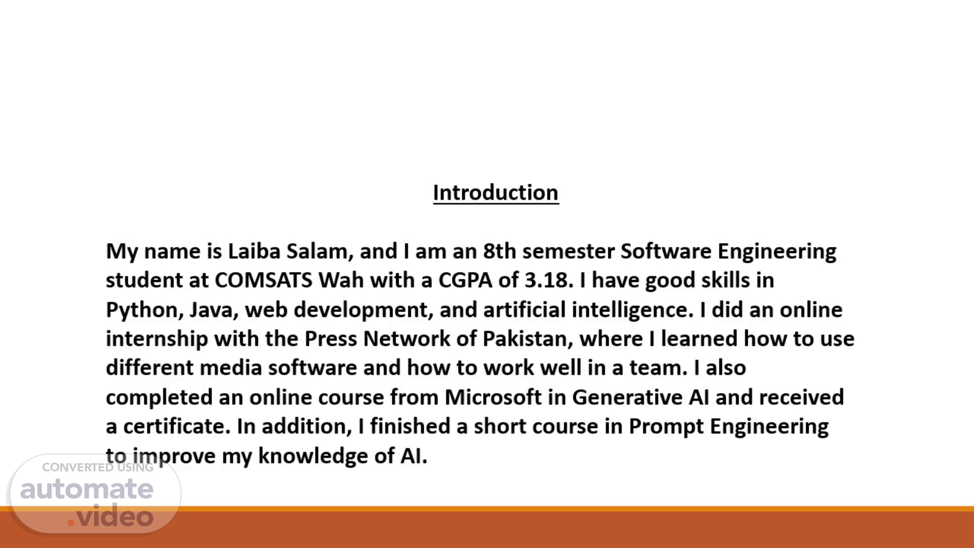 [Audio] My name is Laiba Salam, and I am an 8th semester Software Engineering student at COMSATS Wah with a GPA of 3.18. I have good skills in Python, Java, web development, and artificial intelligence. I did an online internship with the Press Network of Pakistan, where I learned how to use different media software and how to work well in a team. I also completed an online course from Microsoft in Generative AI and received a certificate. In addition, I finished a short course in Prompt Engineering to improve my knowledge of AI..