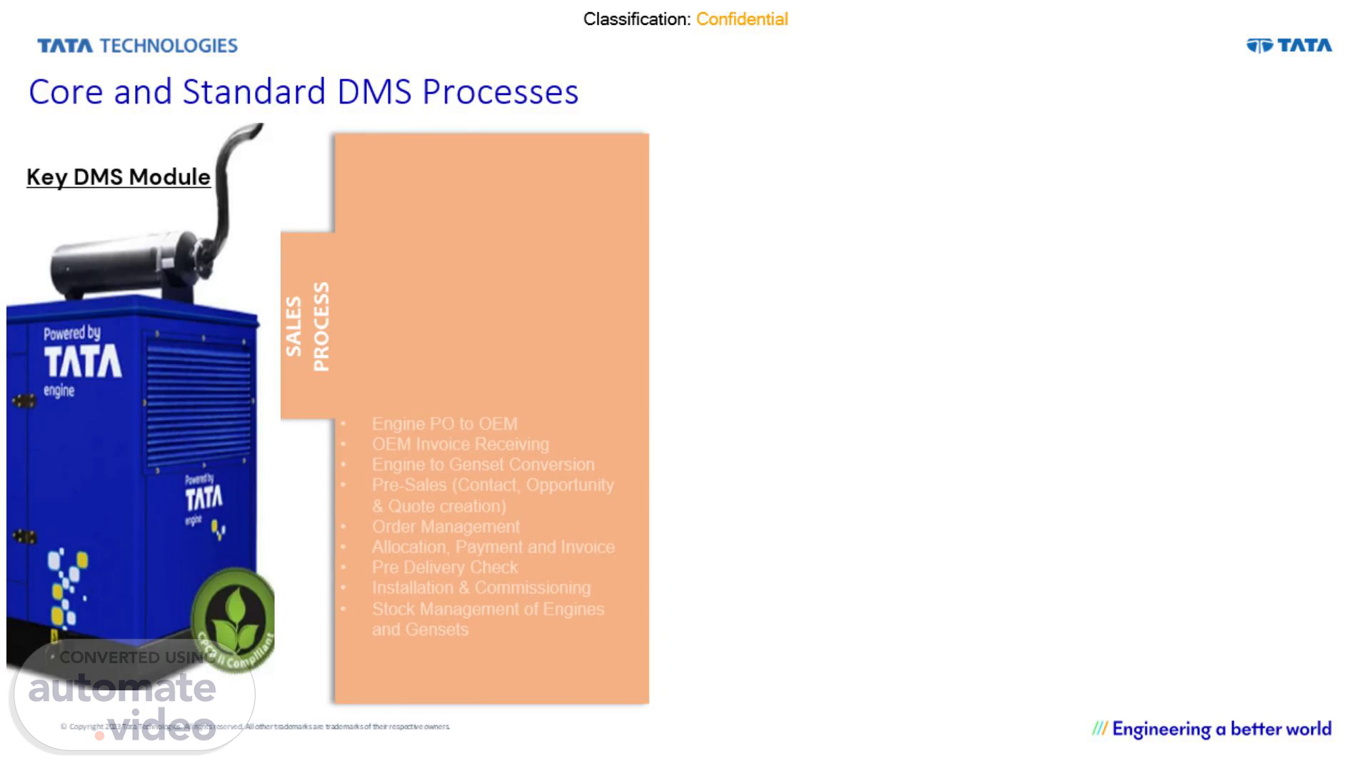 [Audio] Engine PO to O-E-M O-E-M Invoice Receiving Engine to Genset Conversion Pre-Sales (Contact, Opportunity & Quote creation) Order Management Allocation, Payment and Invoice Pre Delivery Check.