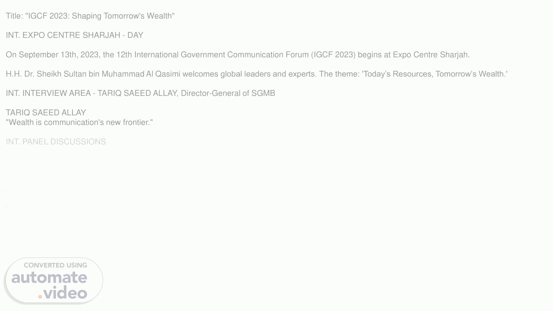 [Virtual Presenter] Title: "IGCF 2023: Shaping Tomorrow's Wealth" INT. EXPO CENTRE SHARJAH - DAY On September 13th, 2023, the 12th International Government Communication Forum (IGCF 2023) begins at Expo Centre Sharjah. H.H. Dr. Sheikh Sultan bin Muhammad Al Qasimi welcomes global leaders and experts. The theme: 'Today’s Resources, Tomorrow’s Wealth.' INT. INTERVIEW AREA - TARIQ SAEED ALLAY, Director-General of SGMB TARIQ SAEED ALLAY "Wealth is communication's new frontier." INT. PANEL DISCUSSIONS 1. Natural Resources 2. Non-material Wealth 3. Technology and Data 4. Emerging Wealth Sectors The world explores how communication shapes future wealth. EXT. EXPO CENTRE SHARJAH - DAY Inspired and empowered, attendees connect, forging a path to tomorrow's wealth. SUPERIMPOSE: "IGCF 2023: Shaping Tomorrow's Wealth" FADE OUT..