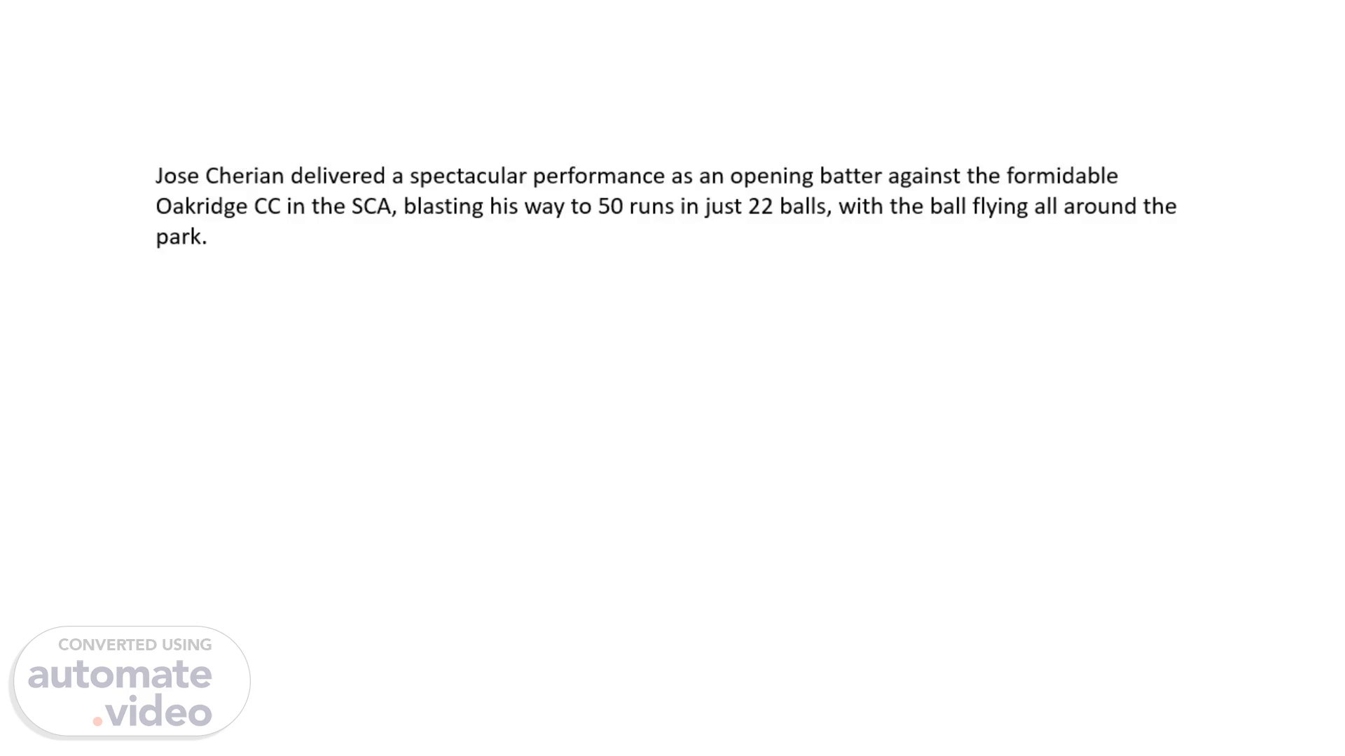 [Audio] Jose Cherian delivered a spectacular performance as an opening batter against the formidable Oakridge CC in the SCA, blasting his way to 50 runs in just 22 balls, with the ball flying all around the park. Jose Cherian delivered a spectacular performance as an opening batter against the formidable Oakridge CC in the SCA, blasting his way to 50 runs in just 22 balls, with the ball flying all around the park..