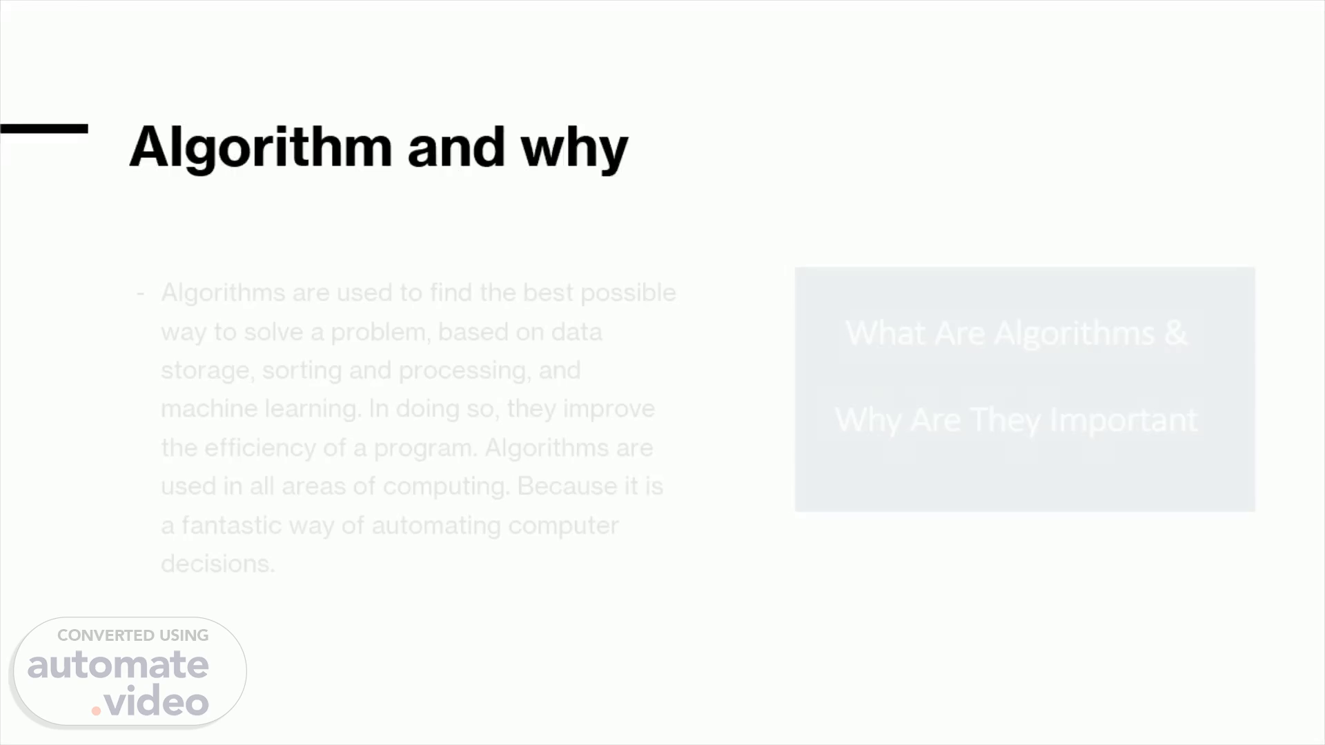 Algorithm and why it is important.. Algorithms are used to find the best possible way to solve a problem, based on data storage, sorting and processing, and machine learning. In doing so, they improve the efficiency of a program. Algorithms are used in all areas of computing. Because it is a fantastic way of automating computer decisions..