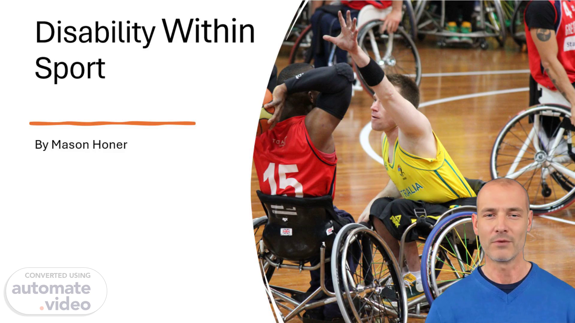 [Virtual Presenter] Good morning everyone. We are here today to discuss how people with disabilities may struggle within the sporting industry and the positive effects that participating in sport can have on physical and mental health. Let's begin by taking a look at disability within sport..