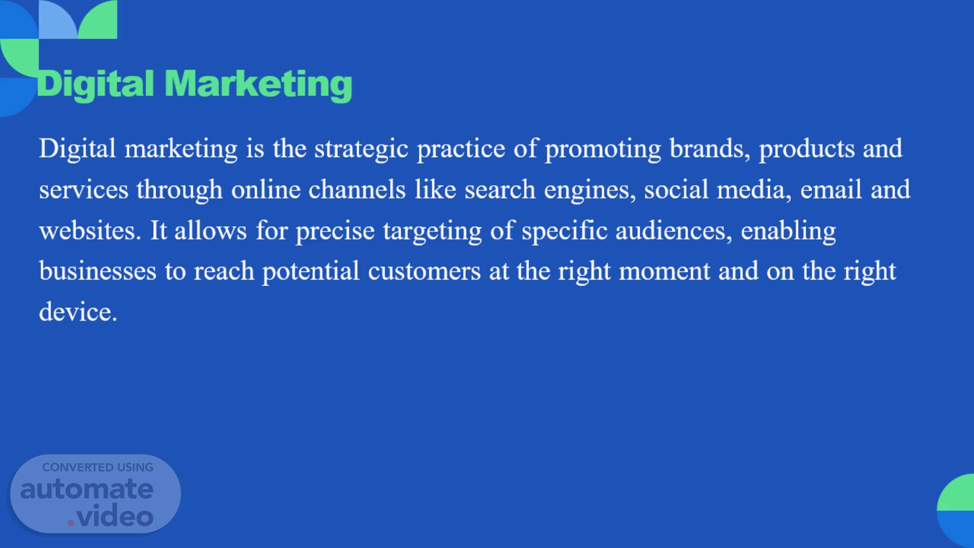 [Audio] Digital Marketing Digital marketing is the strategic practice of promoting brands, products and services through online channels like search engines, social media, email and websites. It allows for precise targeting of specific audiences, enabling businesses to reach potential customers at the right moment and on the right device..