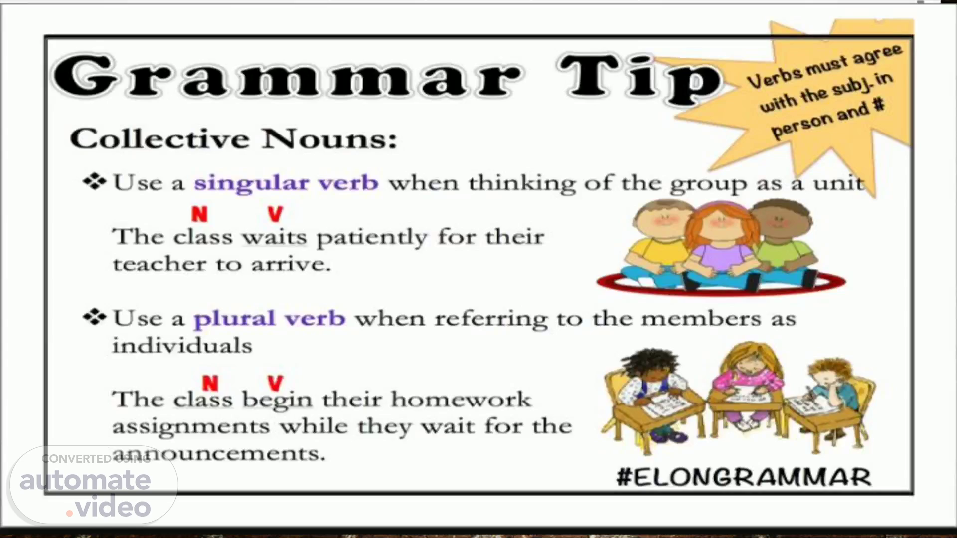 Grannrnar Tip Collective Nouns: • Use a singular verb when thinking Of the group as a unit The class svaits patiently for their teacher to arrive. • Use a plural verb when referring to the tnernbers as individuals The class begin their hon•ework assignrnents while they wait for the announcements. #ELOUCRAMMAR.