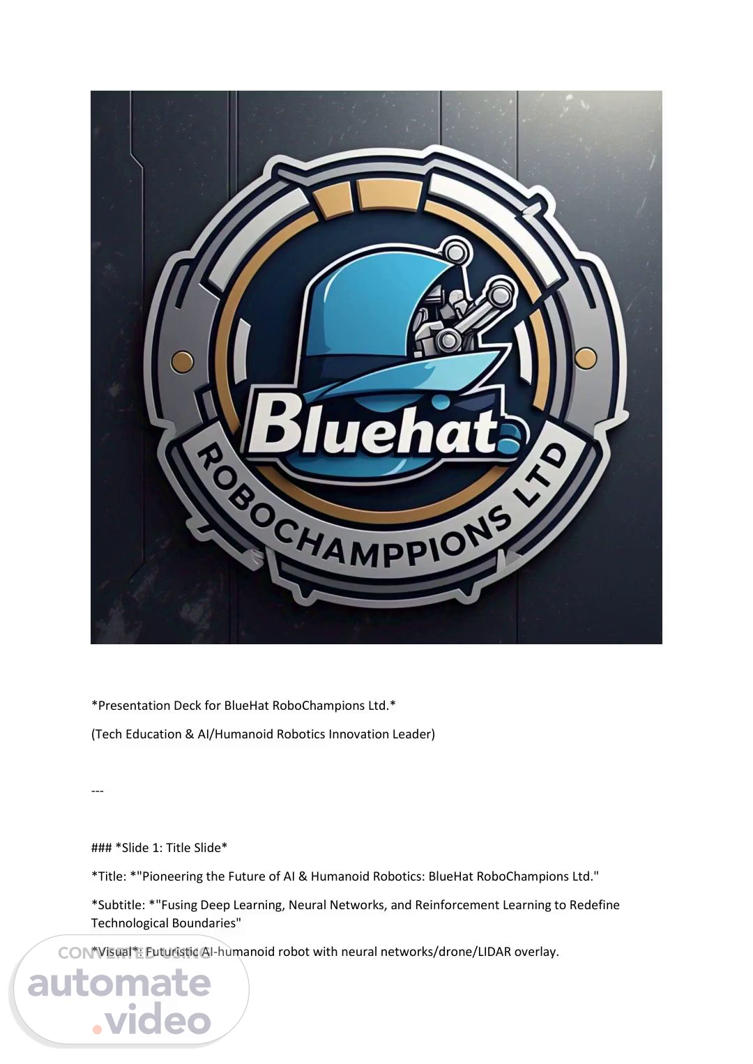 [Audio] *Presentation Deck for BlueHat RoboChampions Ltd.* (Tech Education & AI/Humanoid Robotics Innovation Leader) --- ### *Slide 1: Title Slide* *Title: *"Pioneering the Future of AI & Humanoid Robotics: BlueHat RoboChampions Ltd." *Subtitle: *"Fusing Deep Learning, Neural Networks, and Reinforcement Learning to Redefine Technological Boundaries" *Visual*: Futuristic AI-humanoid robot with neural networks/drone/LIDAR overlay..