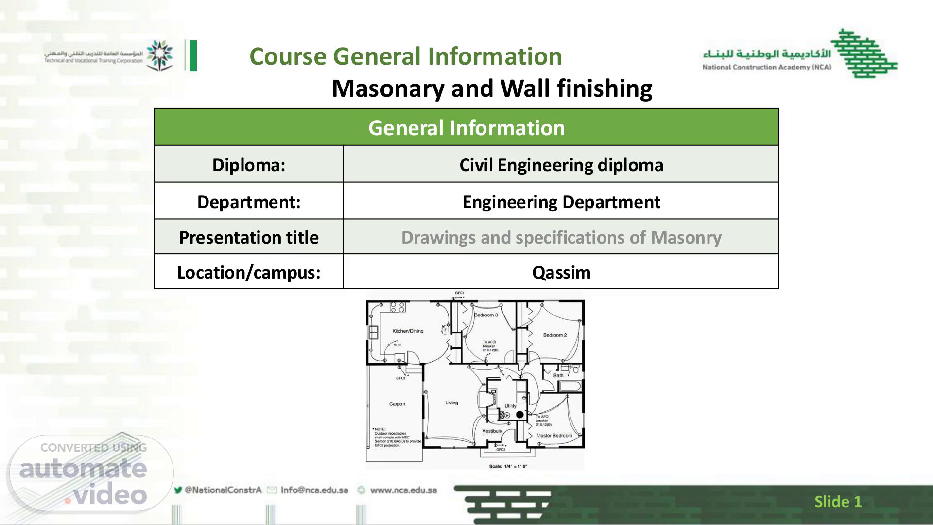 [Audio] Course General Information Masonary and Wall finishing General Information Diploma: Civil Engineering diploma Department: Engineering Department Presentation title Drawings and specifications of Masonry Location/campus: Qassim Slide 1.