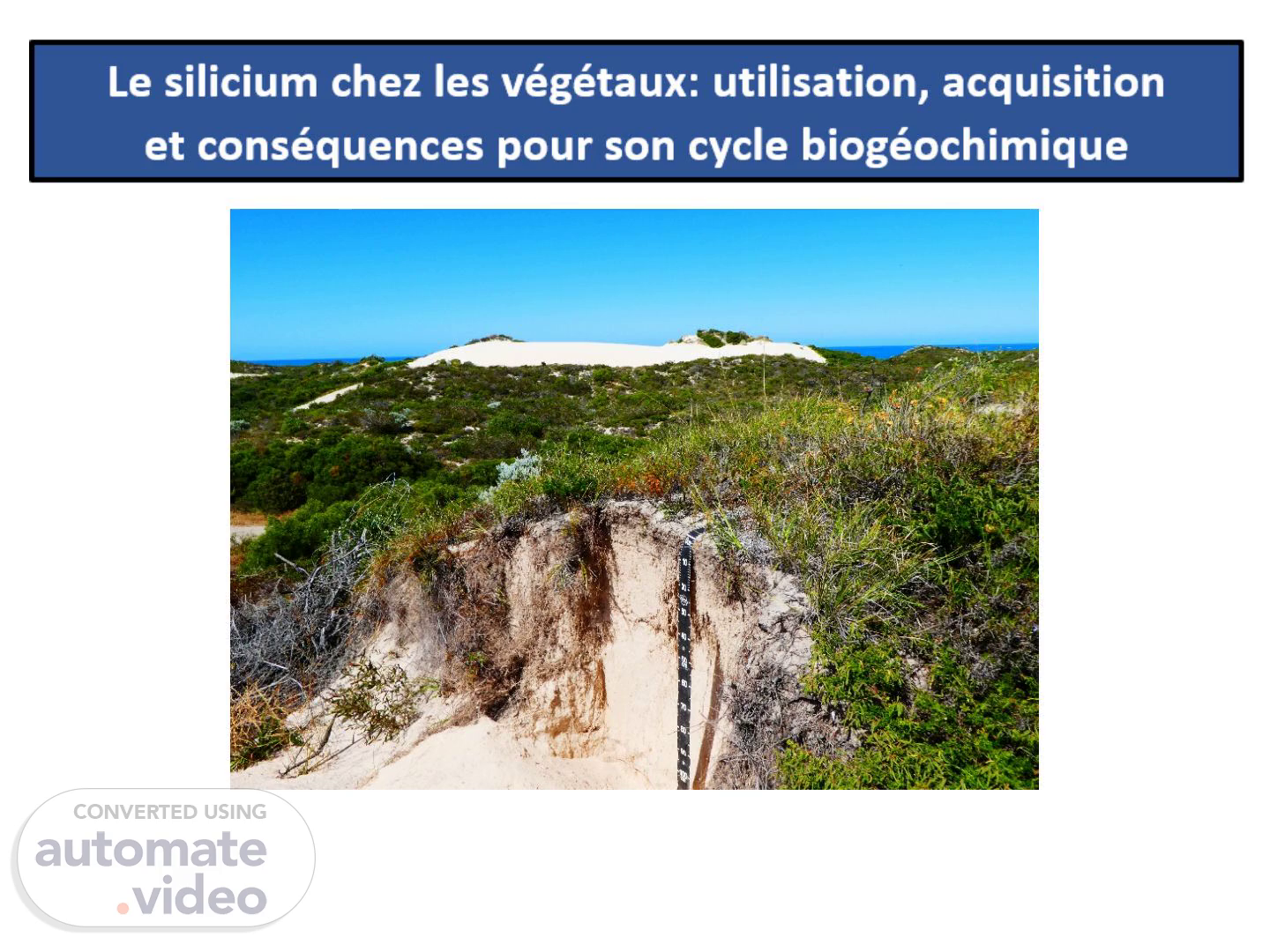 [Audio] Bonjour à toutes et à tous. Je vais mon présenter mon projet de recherche qui vise à mieux comprendre l'utilisation et l'acquisition du Si chez les végétaux afin de mieux comprendre le rôle du compartiment végétal sur son cycle biogéochimique..