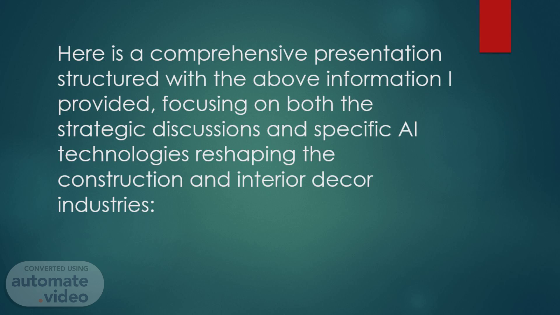 Here is a comprehensive presentation structured with the above information I provided, focusing on both the strategic discussions and specific AI technologies reshaping the construction and interior decor industries:.